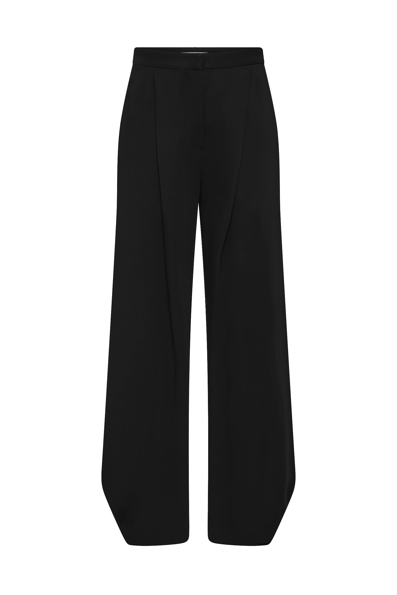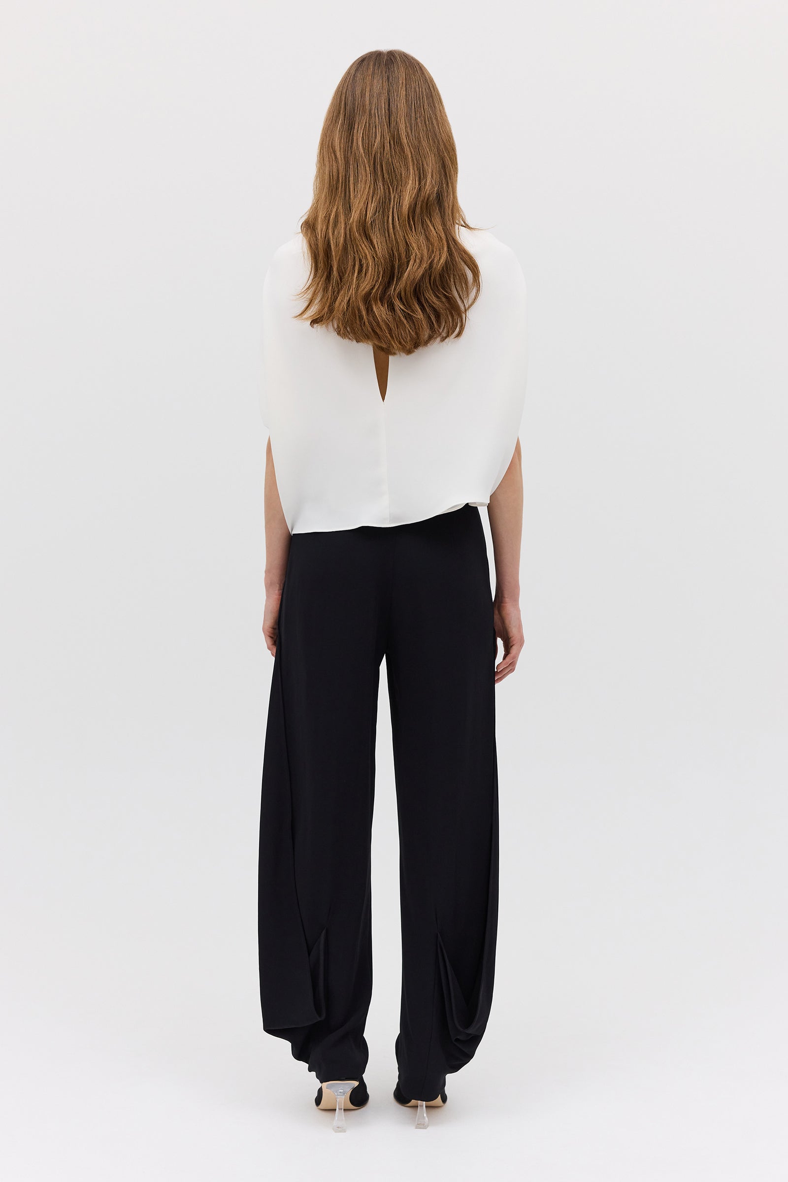 A modern take on fluid tailoring, the Black Crepe Surrender Pant offers structure and softness in equal measure. Cut in a flowing crepe, the pant sits high on the waist with soft front pleats and a flattering tailored fit through the hip. The silhouette tapers subtly into an open calf detail, adding movement and ease. Finished with side pockets, a zip fly, and discreet metal hook closure, it’s an elevated wardrobe essential—designed to balance bold statement tops or complement refined classics.