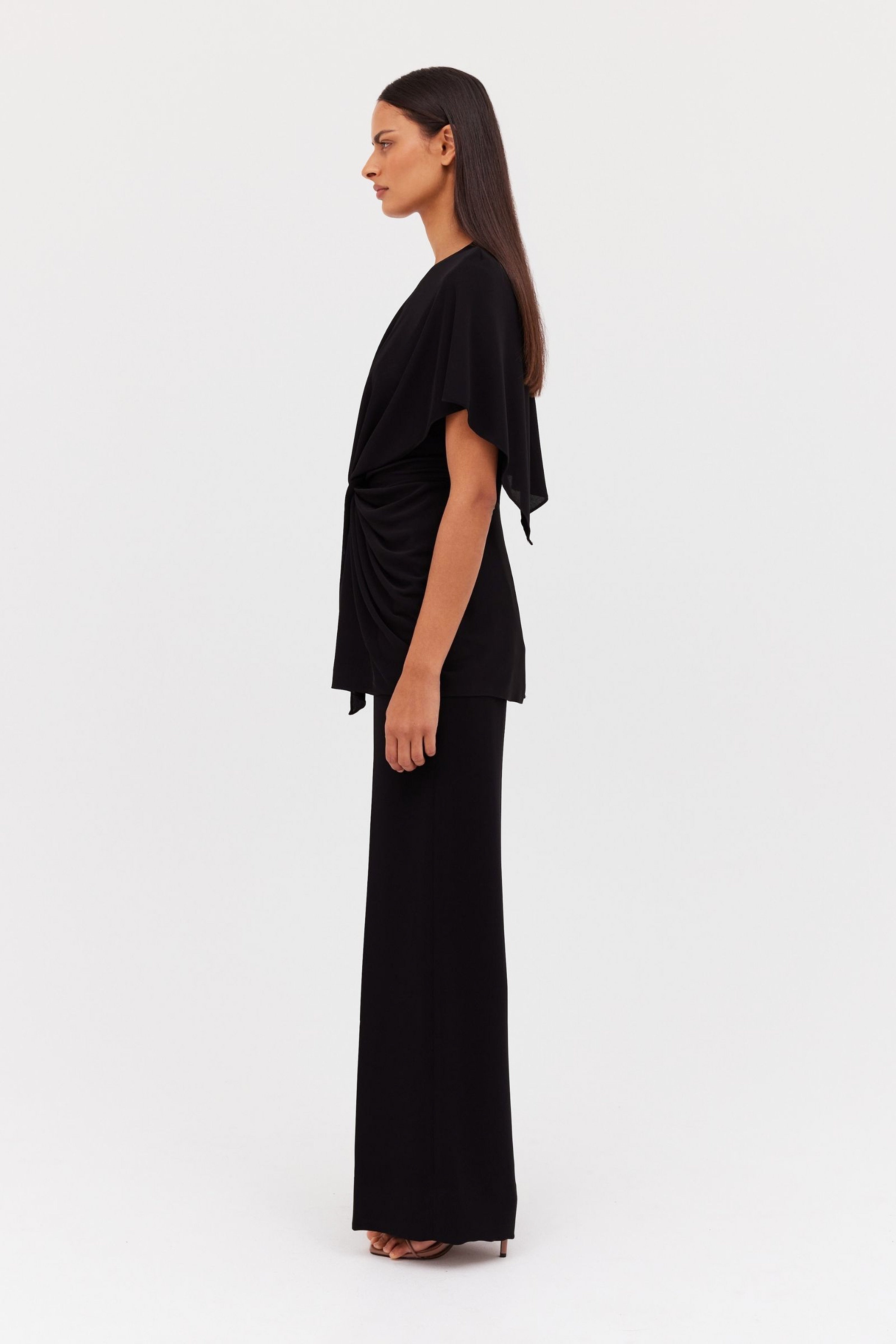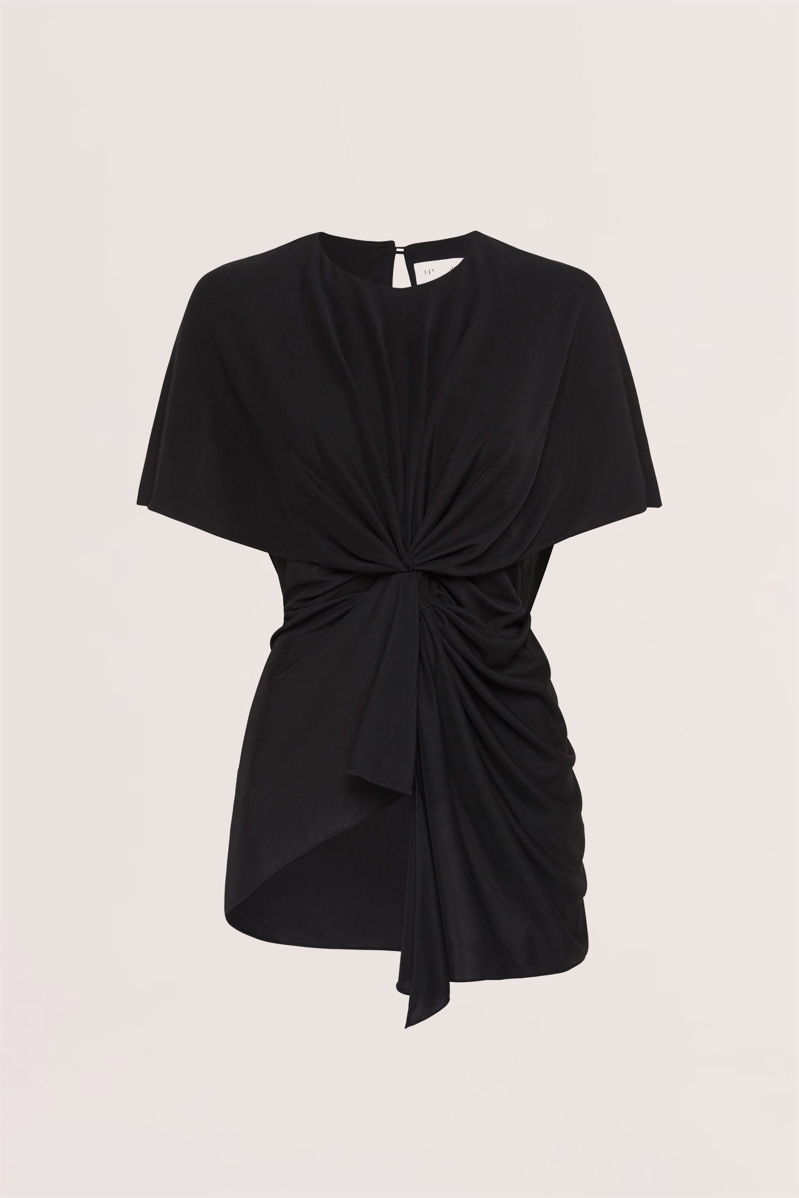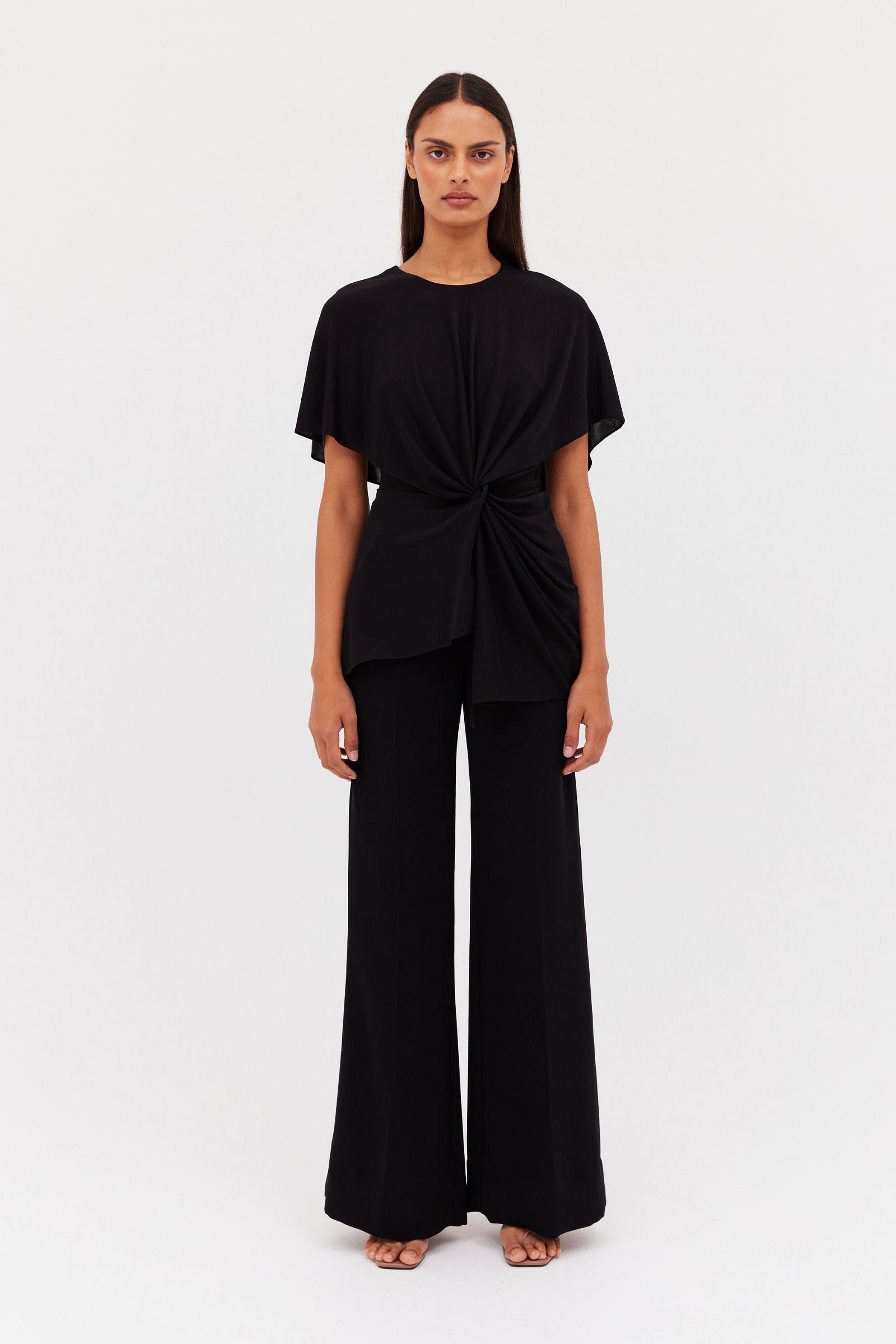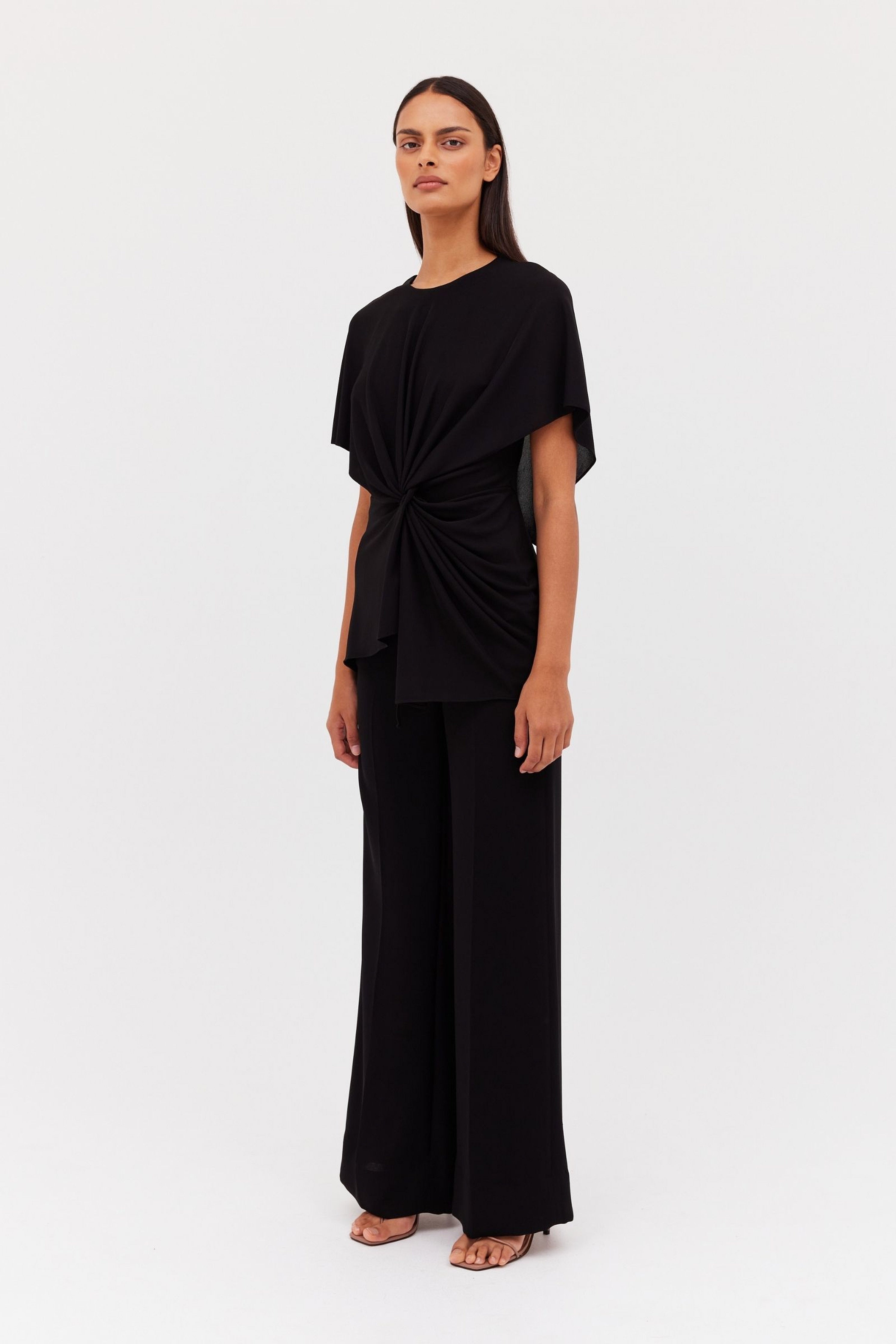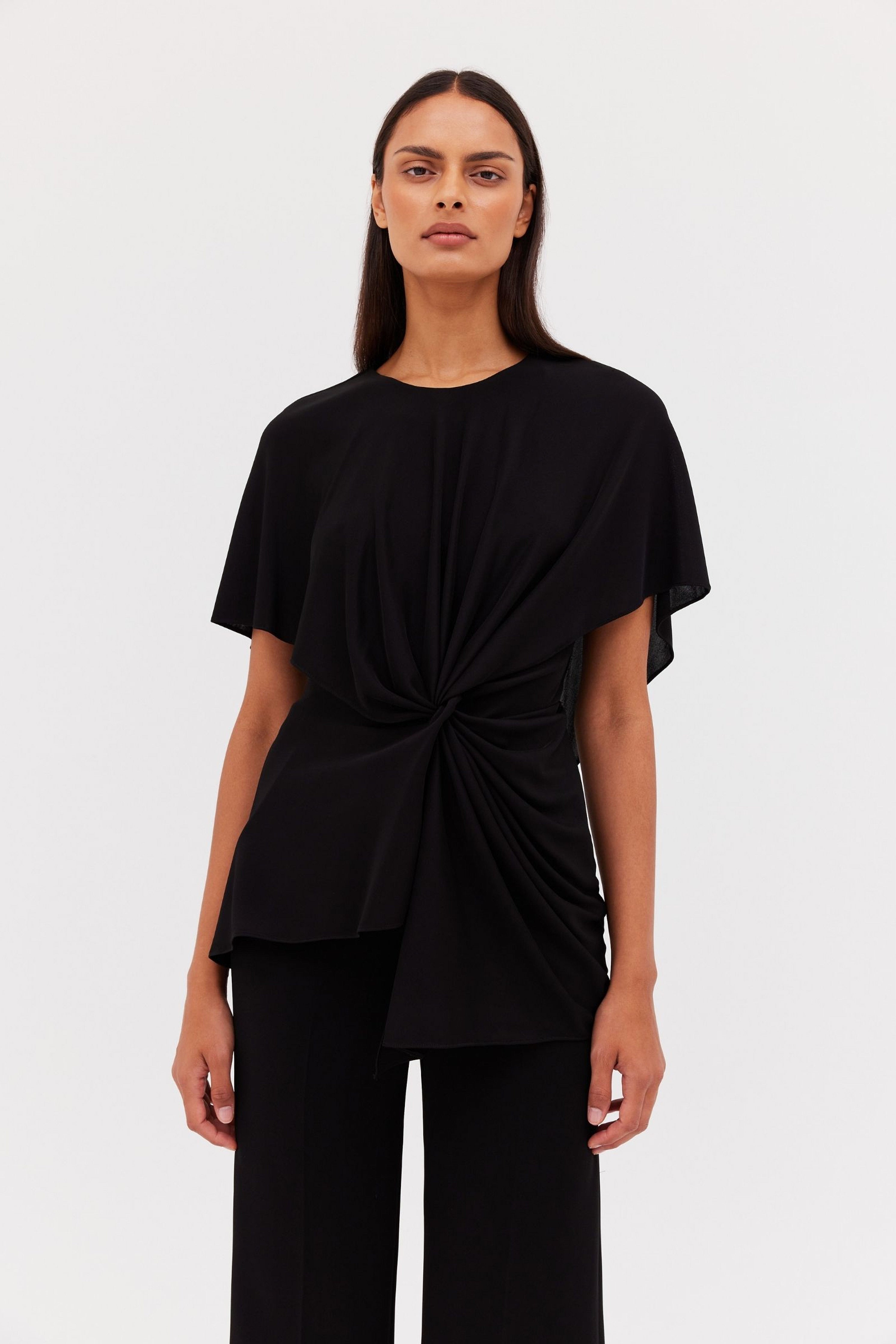 Soft sleeve draped, crew neck top featuring twist at the waist. Summer weight jersey top. Easy care, wash and wear fabrication.