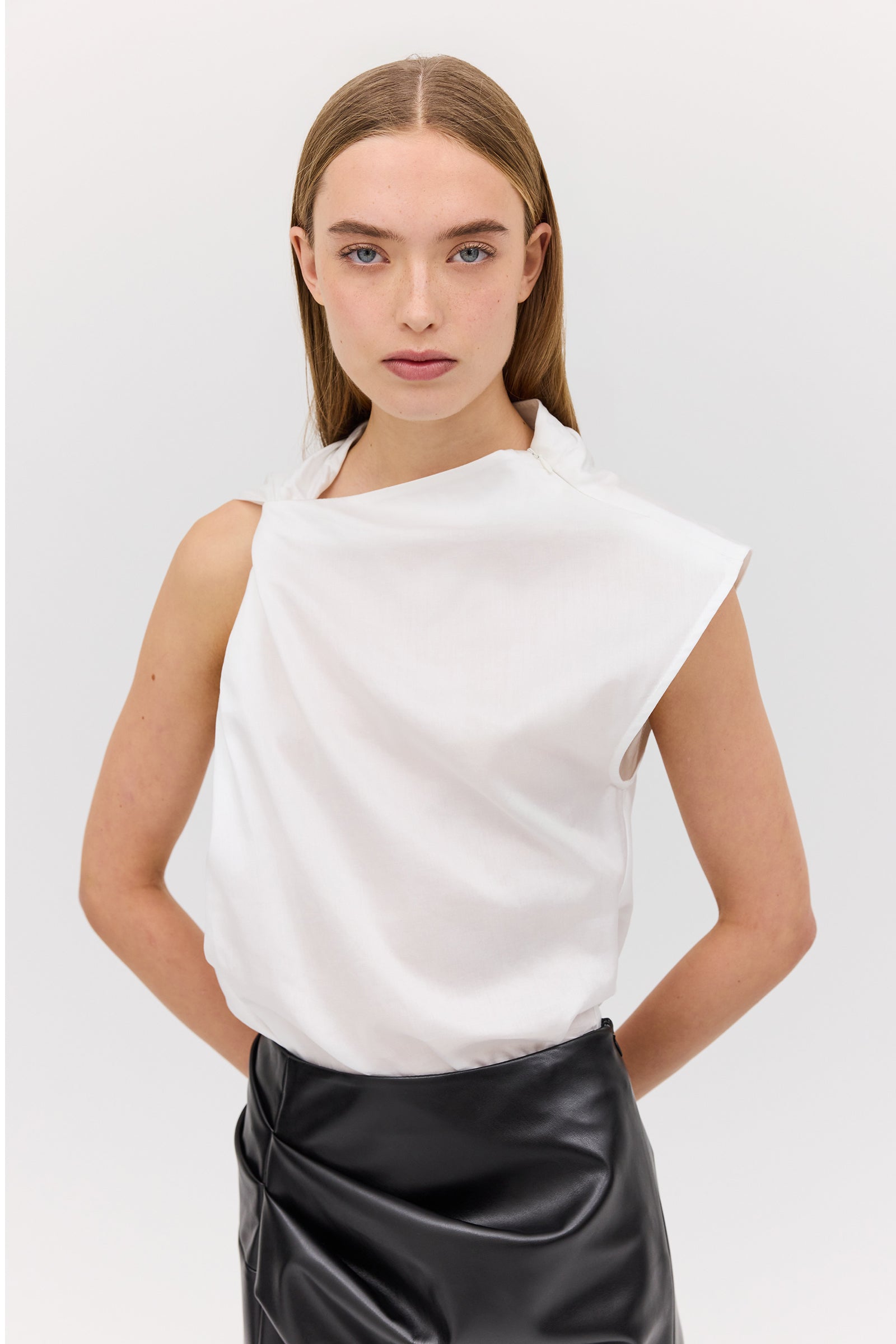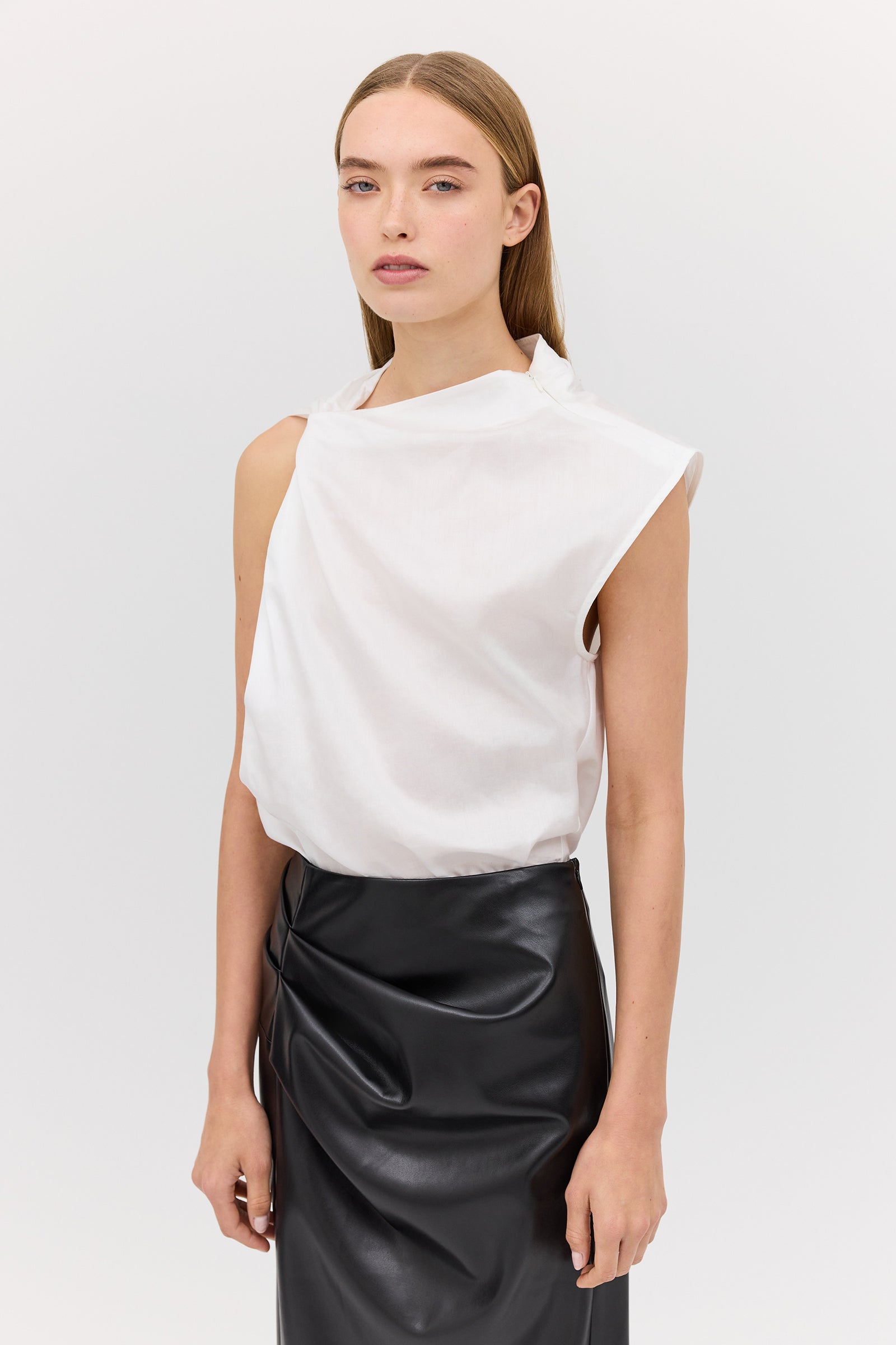 The White Cotton Yang Top is a classic with a twist, quite literally. Crafted from expertly draped cotton, with an asymmetrical boat neckline that features signature Bianca Spender twist detailing at the shoulder, allowing the fabric to follow the form of the body.