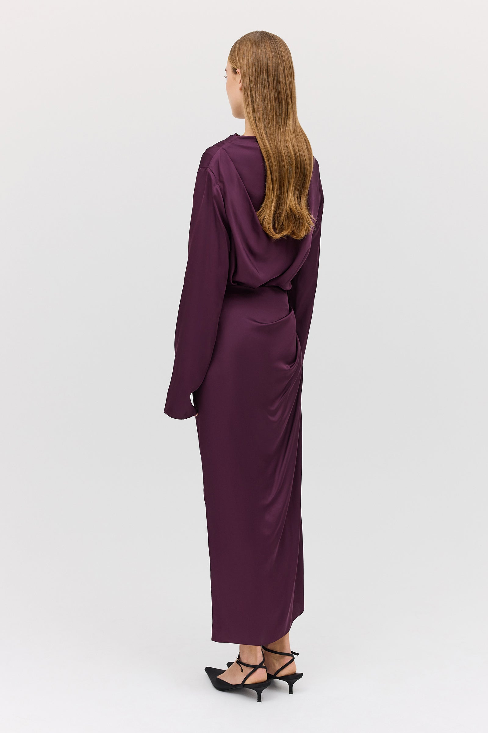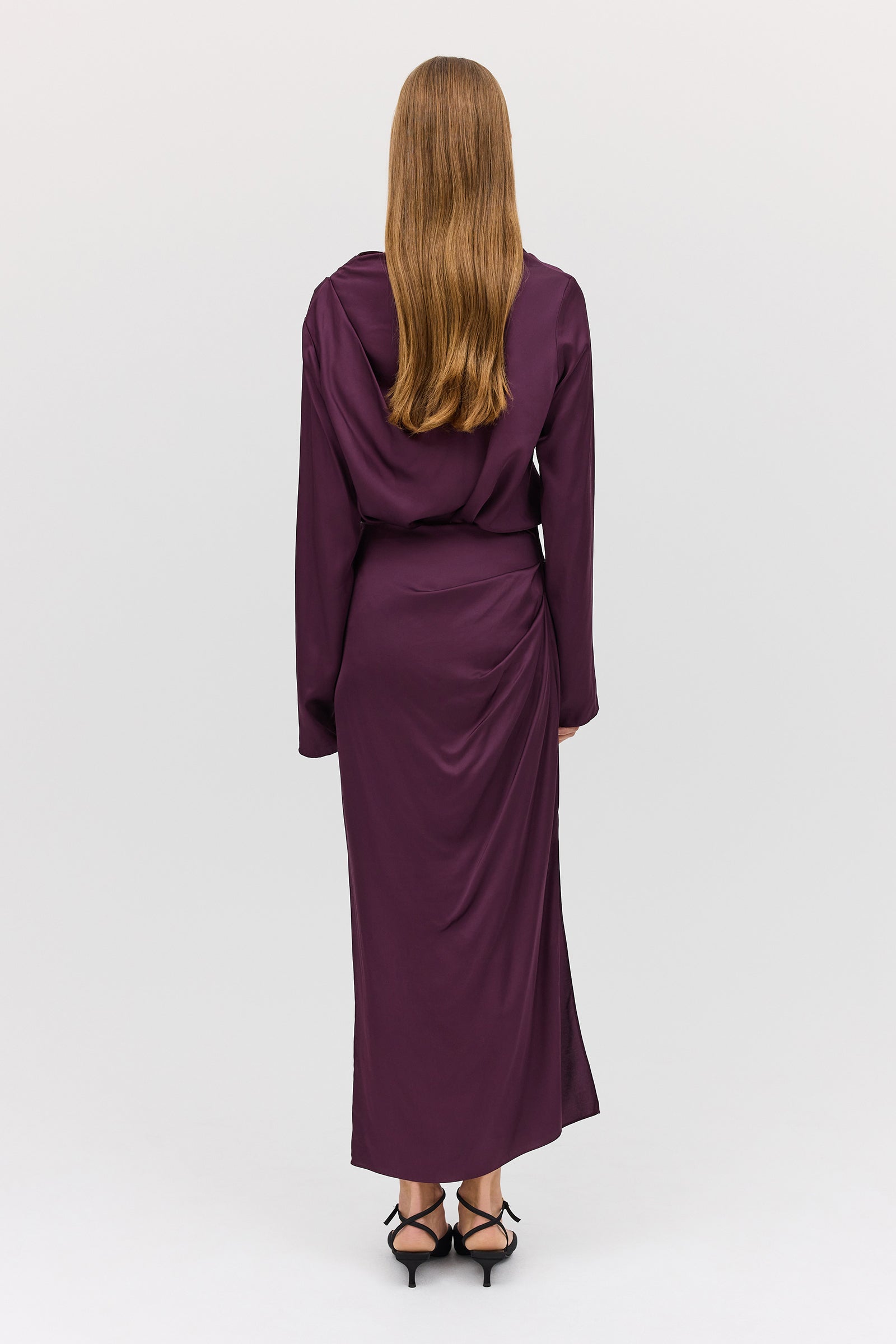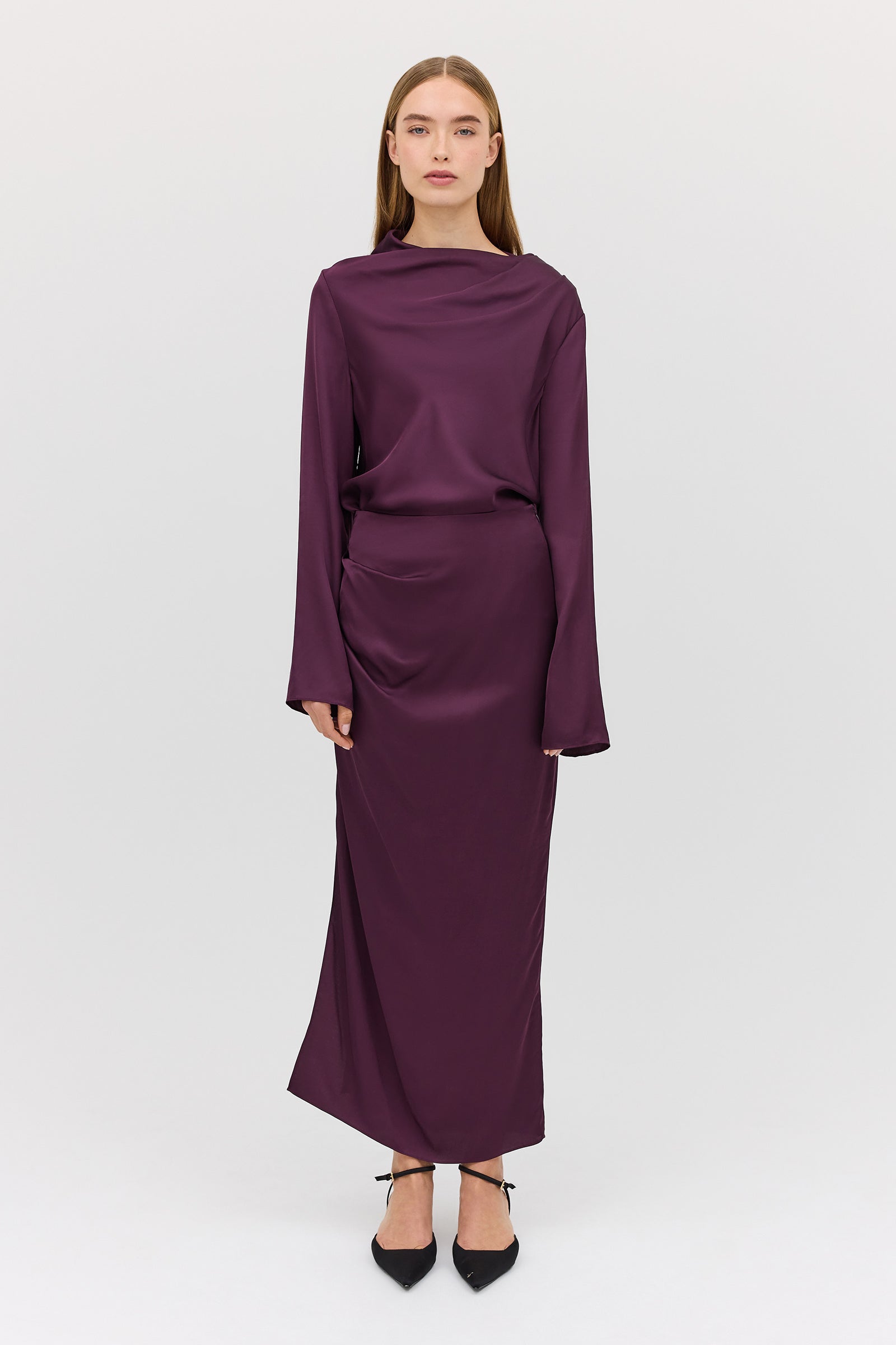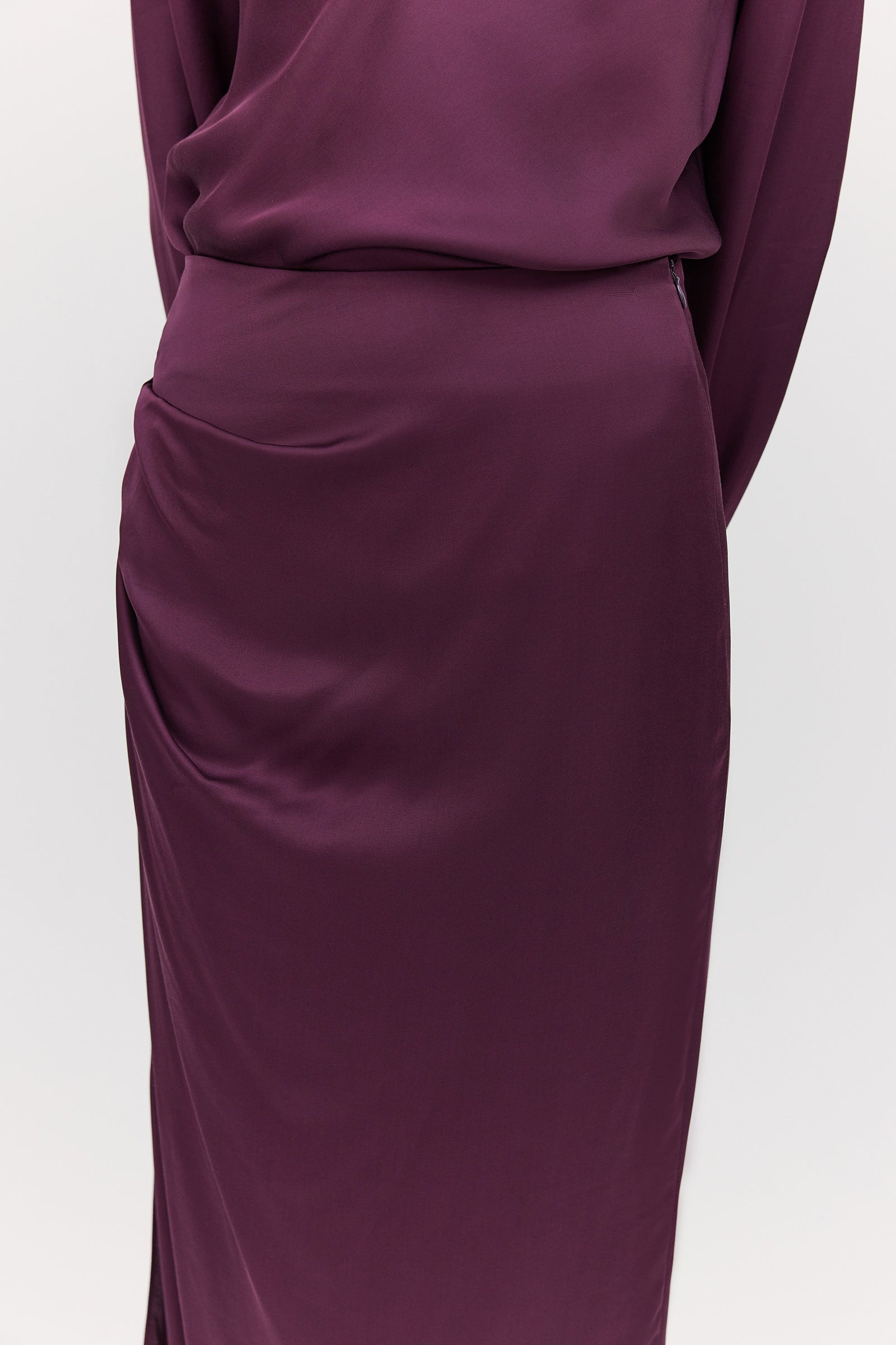 Introducing the Aubergine Satin Amity Skirt. This slip-style skirt is free-flowing and fluid, with subtle gathers at the side seam to give the piece a handheld feel. Origami-like folds add an intricacy to a simple silhouette.