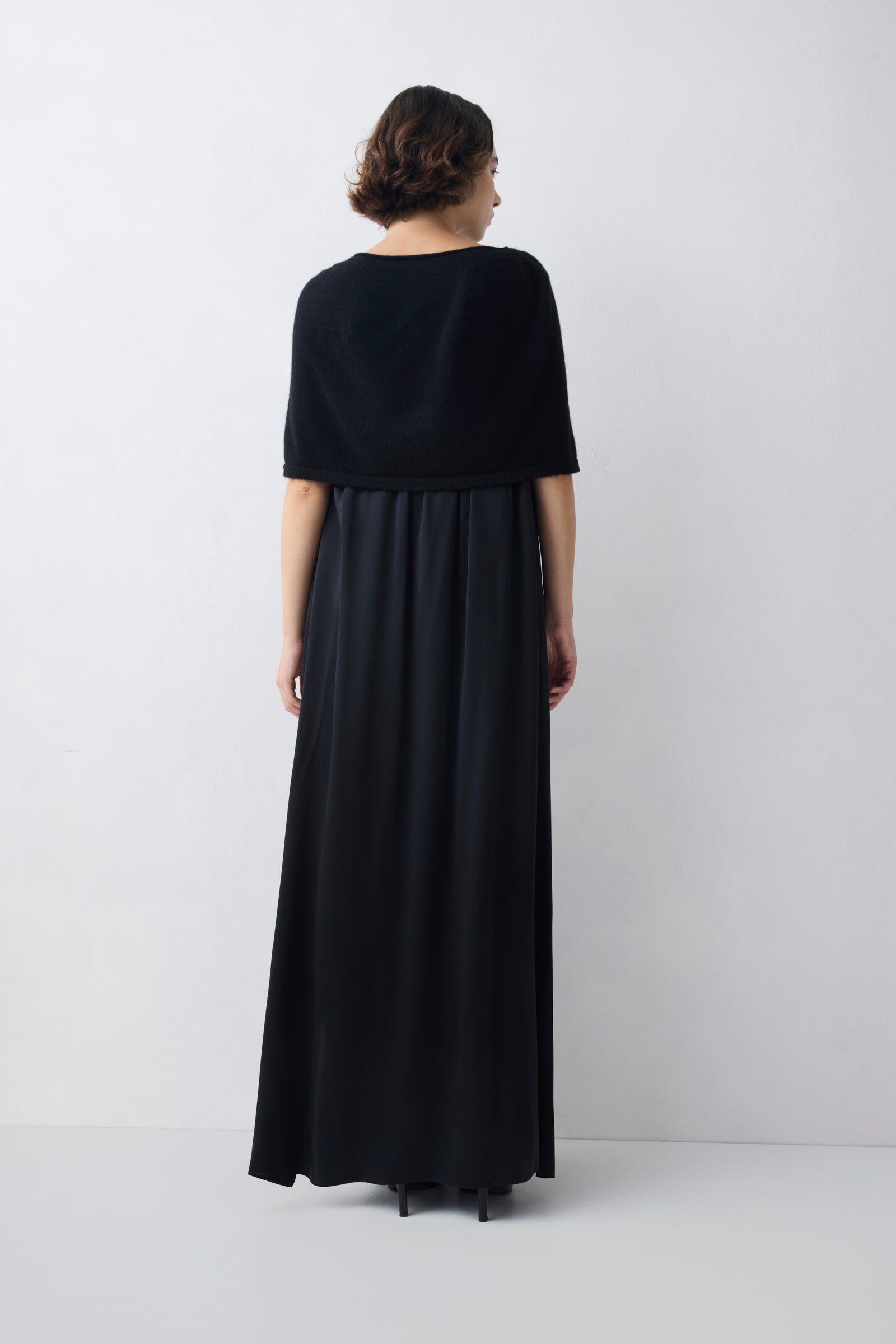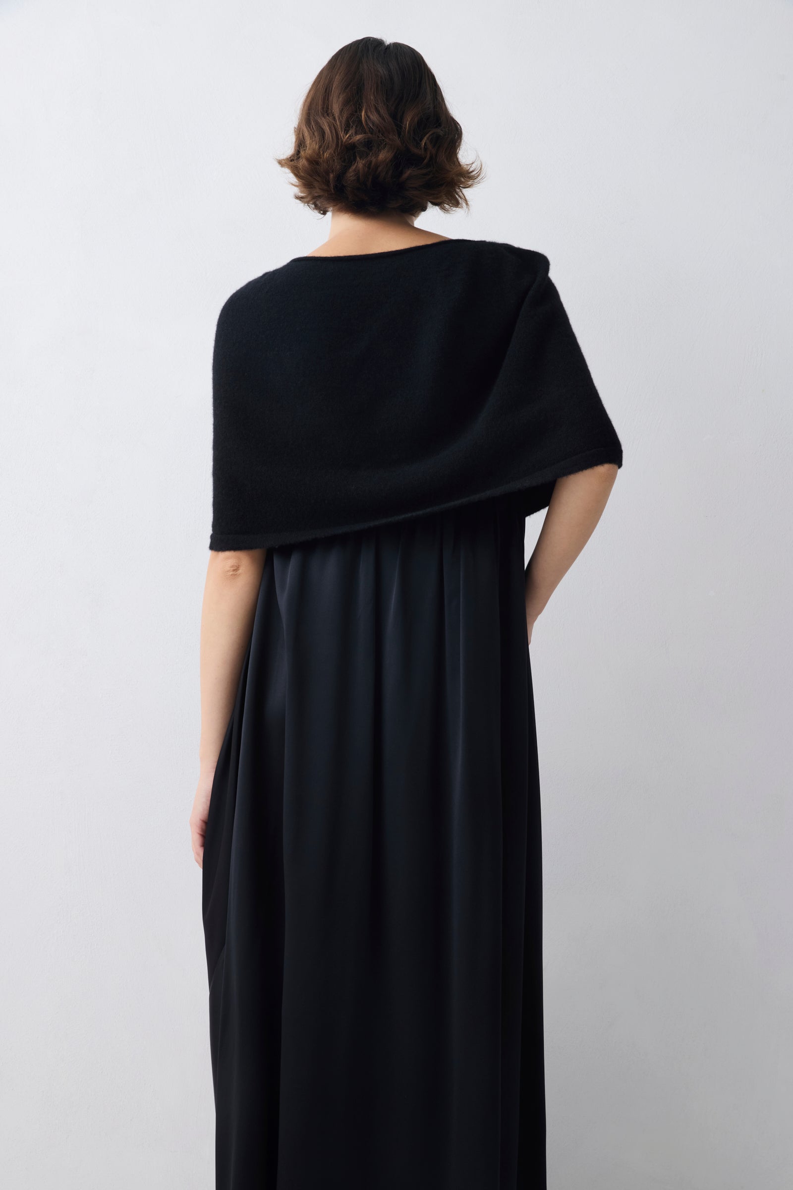 The relaxed cape silhouette rests across the shoulders, creating gentle movement through the form while maintaining a clean, minimal line.