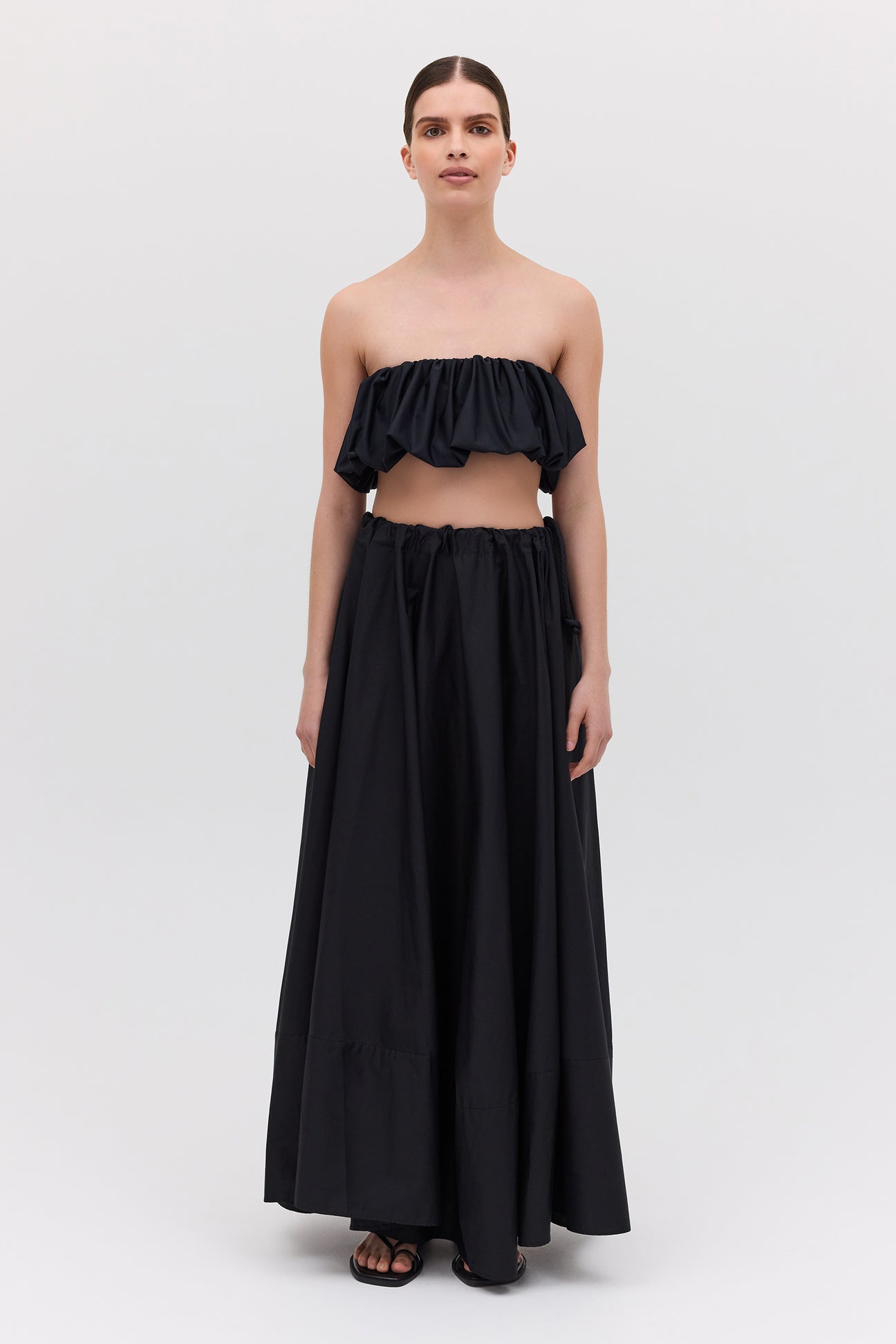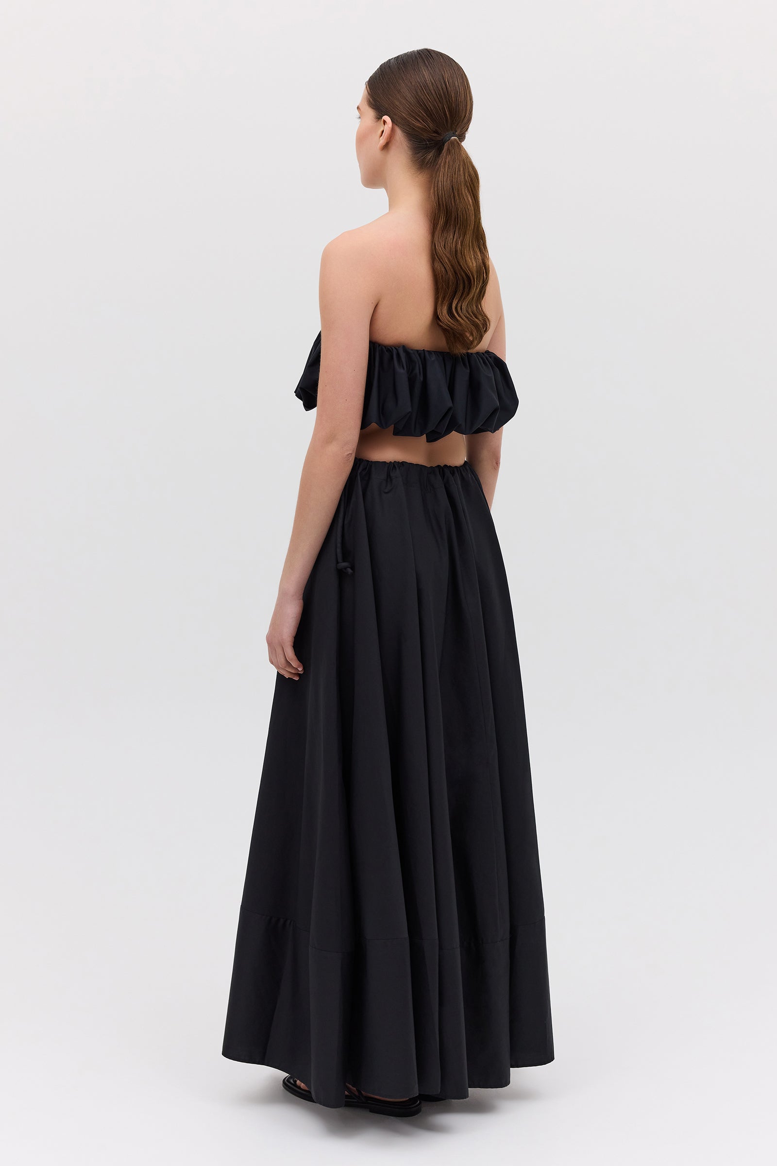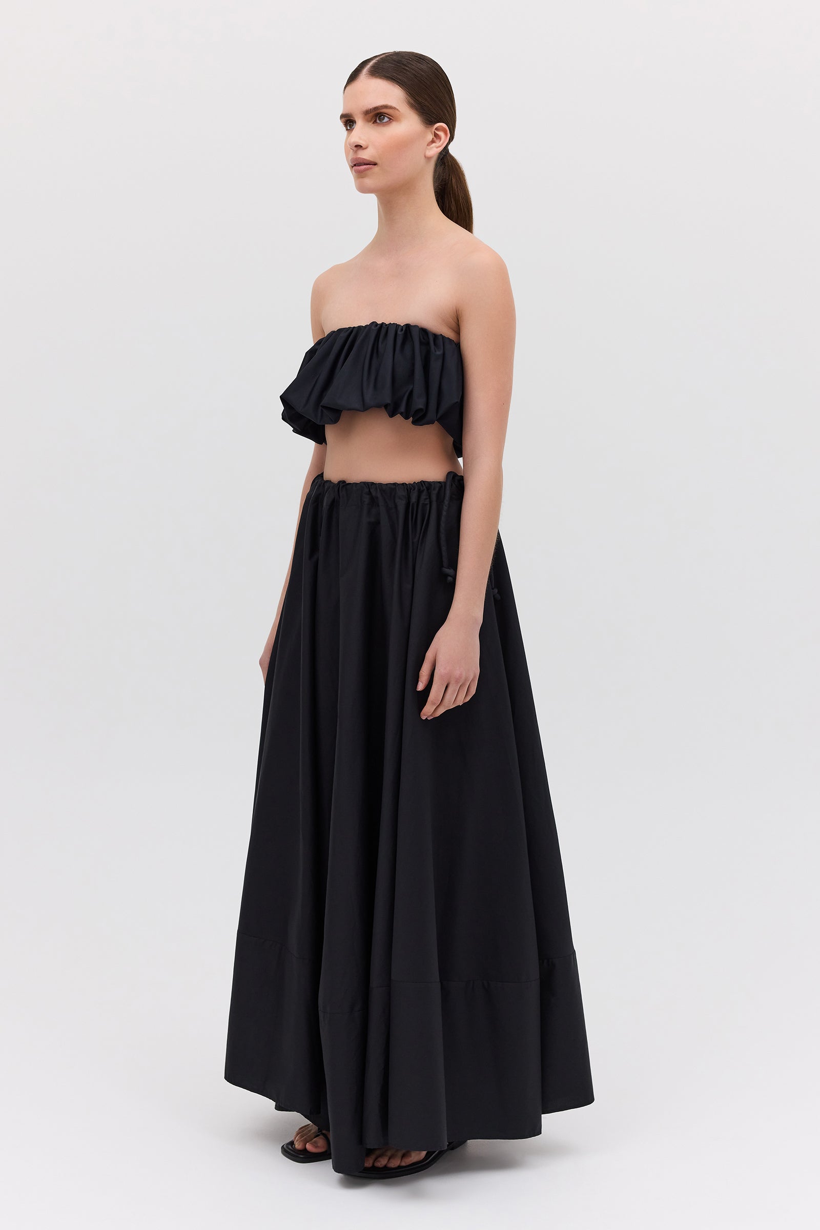 An evolution of the beloved Effuse Skirt, the Santana Skirt reinterprets its fluid silhouette in crisp black cotton. The result is a voluminous yet grounded piece that captures movement through form rather than fabric. Falling from a soft, gathered drawstring waist, the skirt creates effortless volume and gentle structure, offering an elevated take on summer ease. The cotton fabrication lends a sense of polish and wearability, perfect for both day and evening moments.