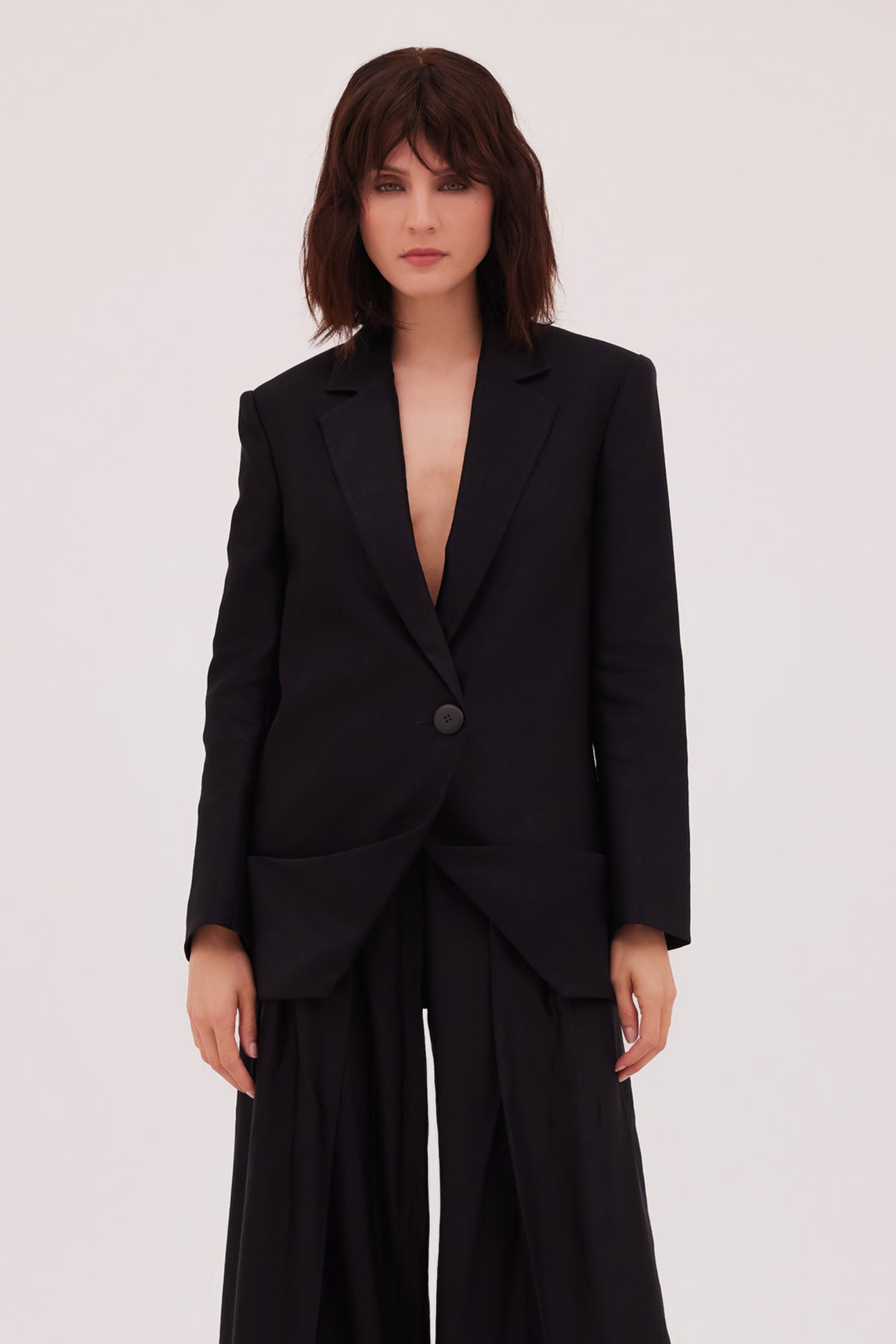The Evoke Jacket in Black Linen Twill features Bianca Spender signature handwriting. A play on traditional tailoring with folds to add an element of softness.