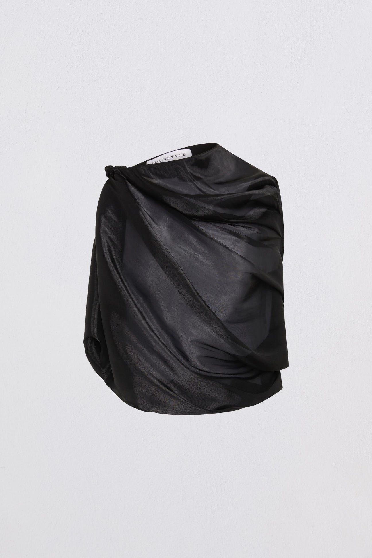 Sculptural and soft in equal measure, the Tumble Top in Black Liquid Organza plays with volume and lightness. Featuring a twist shoulder detail and round neckline, the sleeveless silhouette blouses gently into an elastic waist, creating a fluid shape that feels both airy and refined. The sheer silk organza adds a sense of transparency and movement, designed to float against the body. Worn layered or alone, it captures the essence of modern femininity with ease.