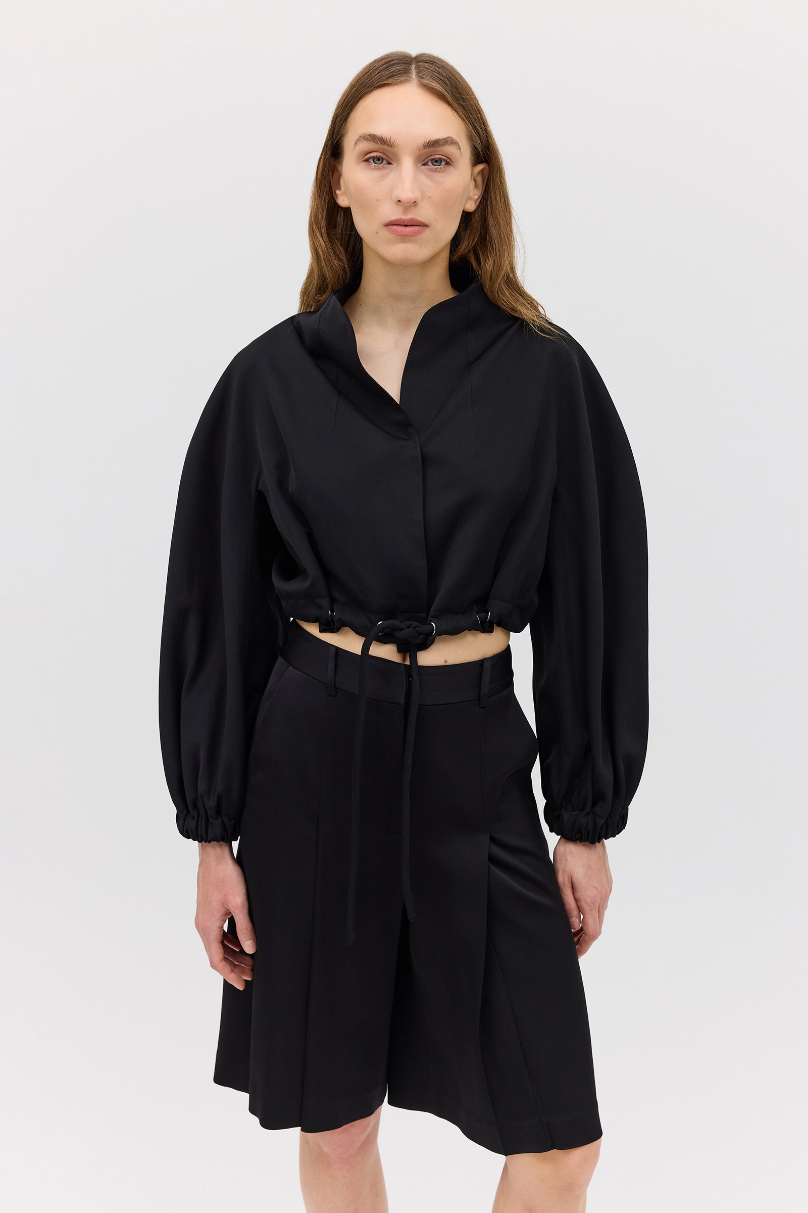 Playing with volume, true to the aviation styles that inspired it, this relaxed, soft-silhouette bomber jacket is made from Black Crepe, featuring eyelets and a drawstring waist - synonymous with our Spring 2023 Runway collection and has statement puffed sleeves. Designed with the intention of wearing open as a deep V-neck top, pair with the Rafael Skirt or Surges shorts.