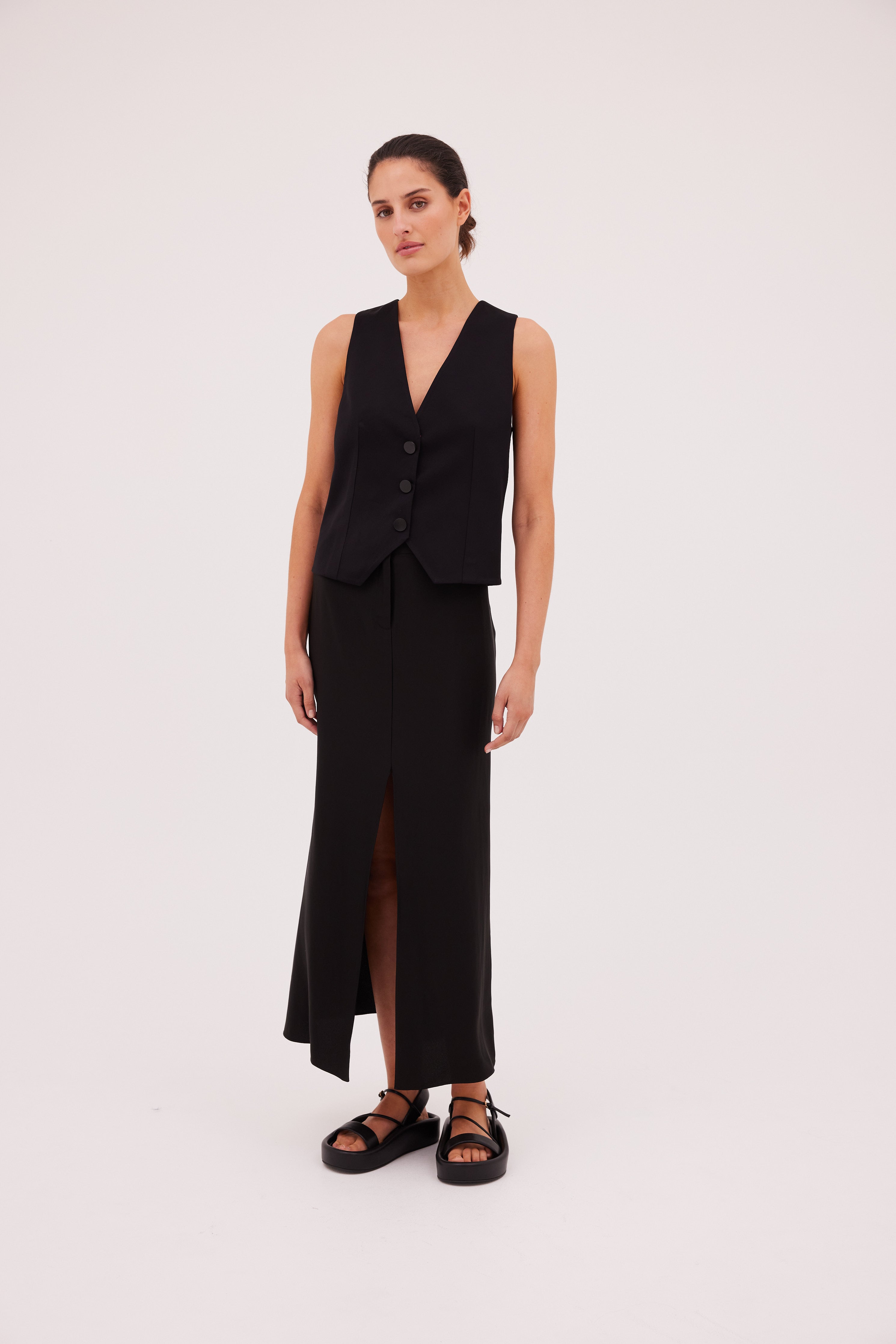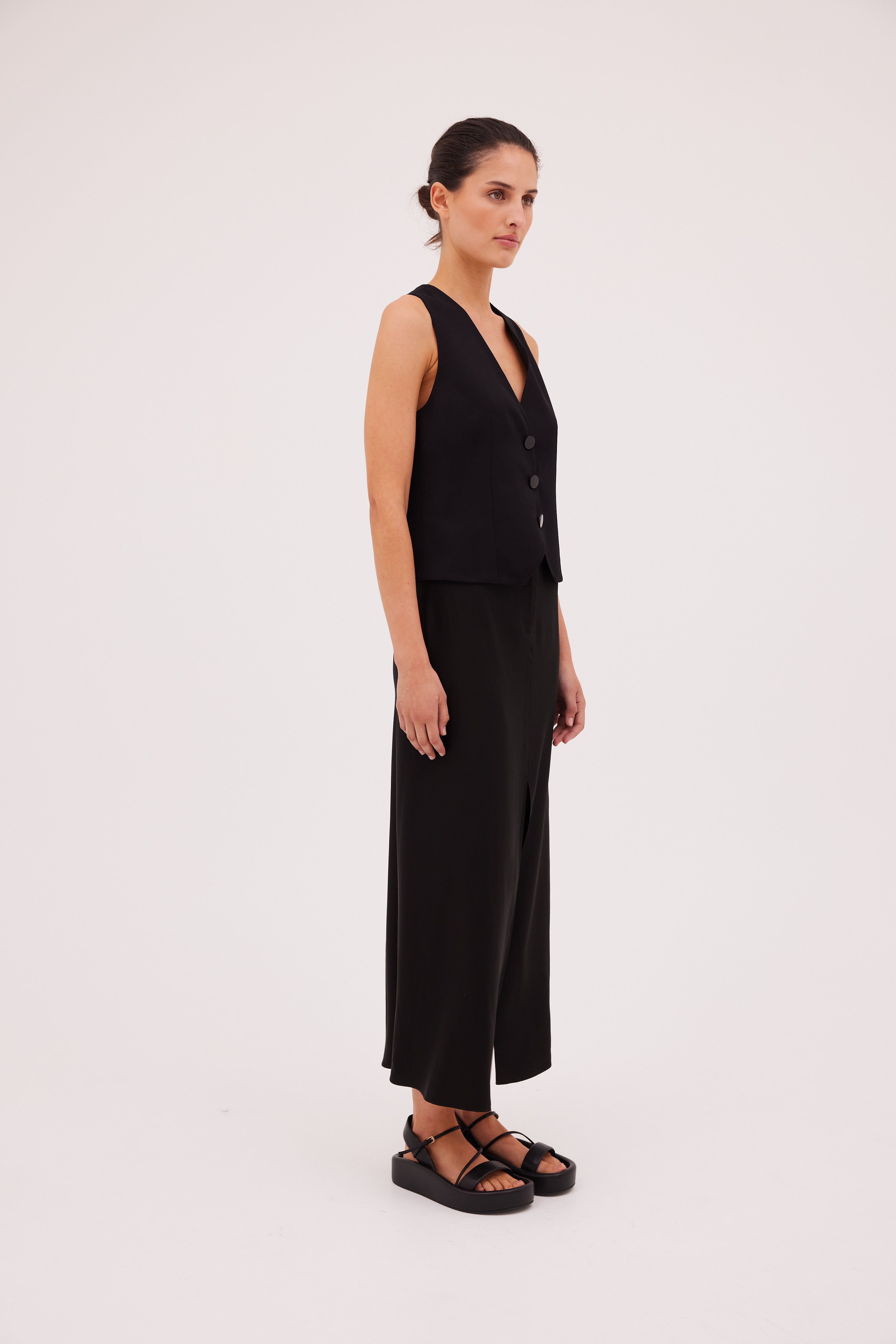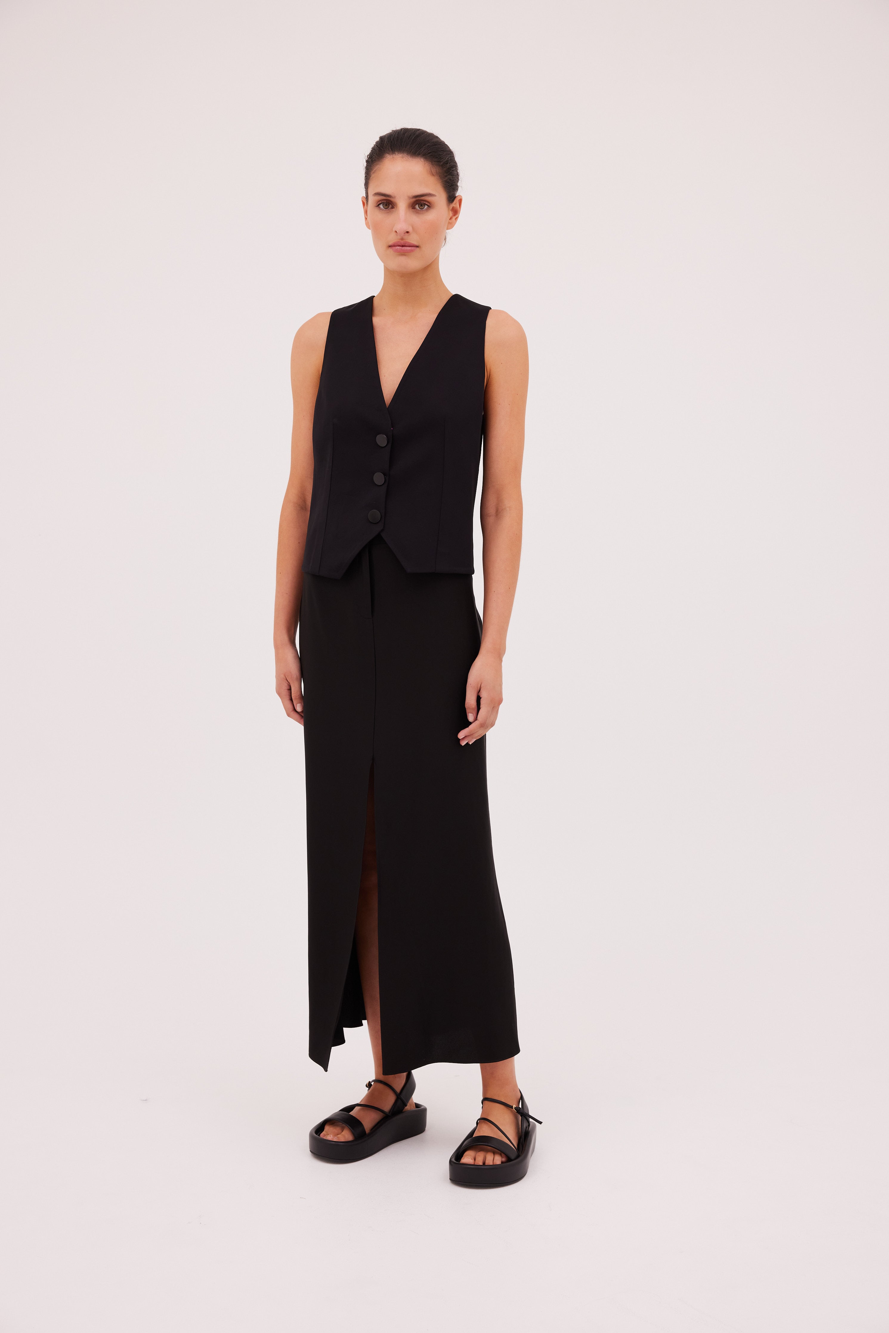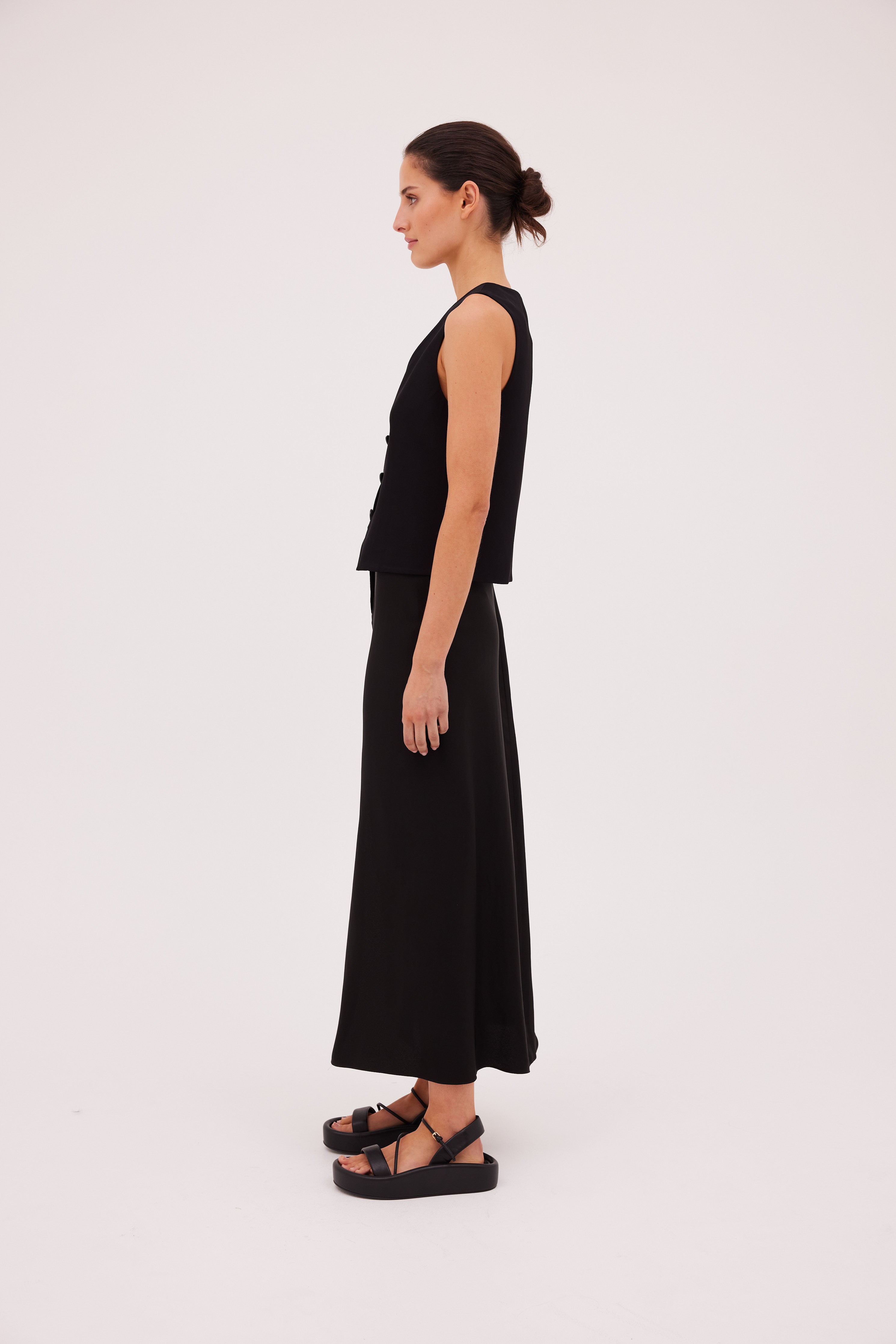 Welcoming a new style, a twist on an old classic. The Black Satin Crepe Dwyer Skirt is versatile and comfortable for work or day dressing. A soft A-line skirt is fitted through the waist and hips and finishes mid-calf. Fastening through the front with an invisible zip-fly.