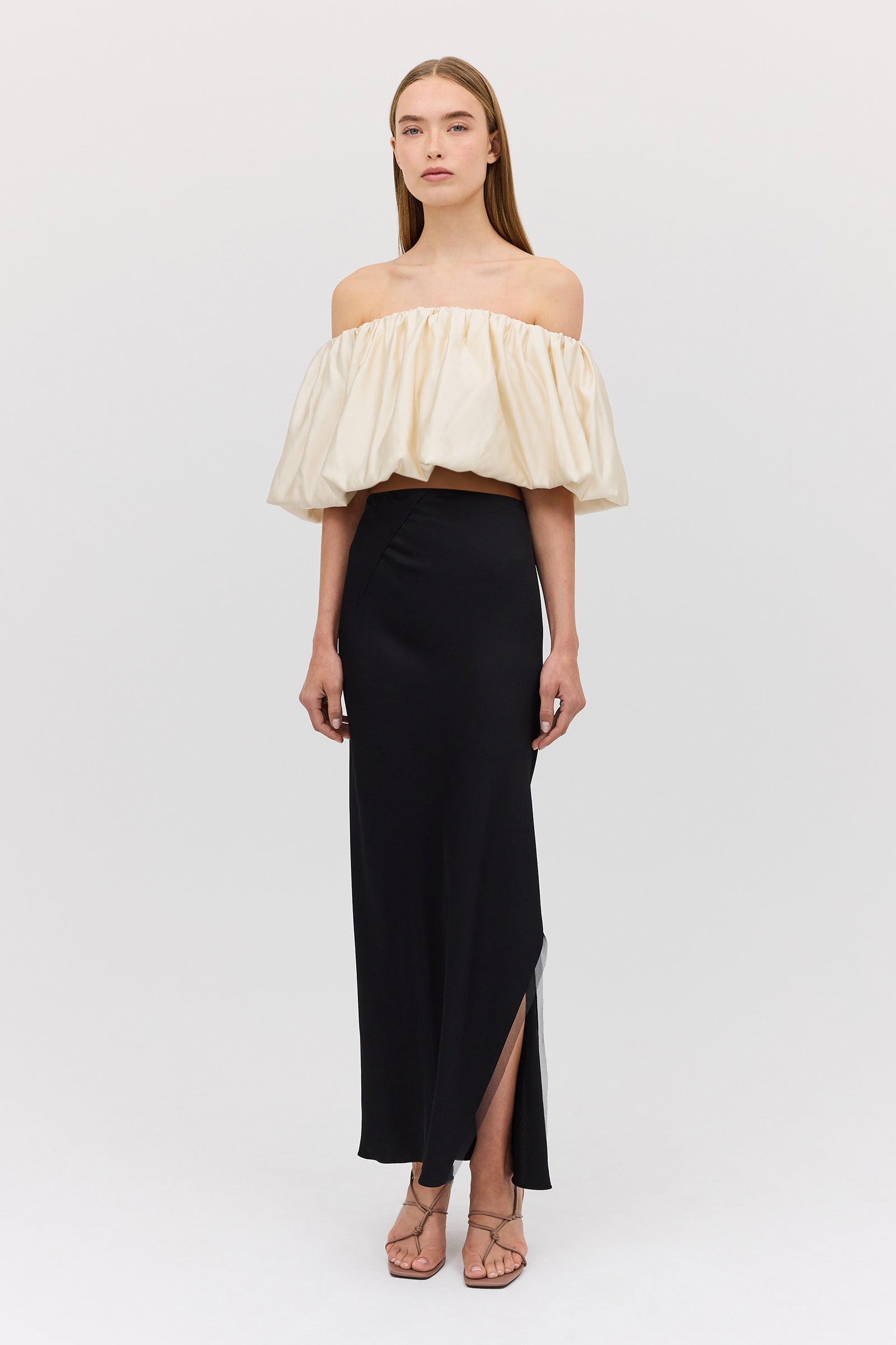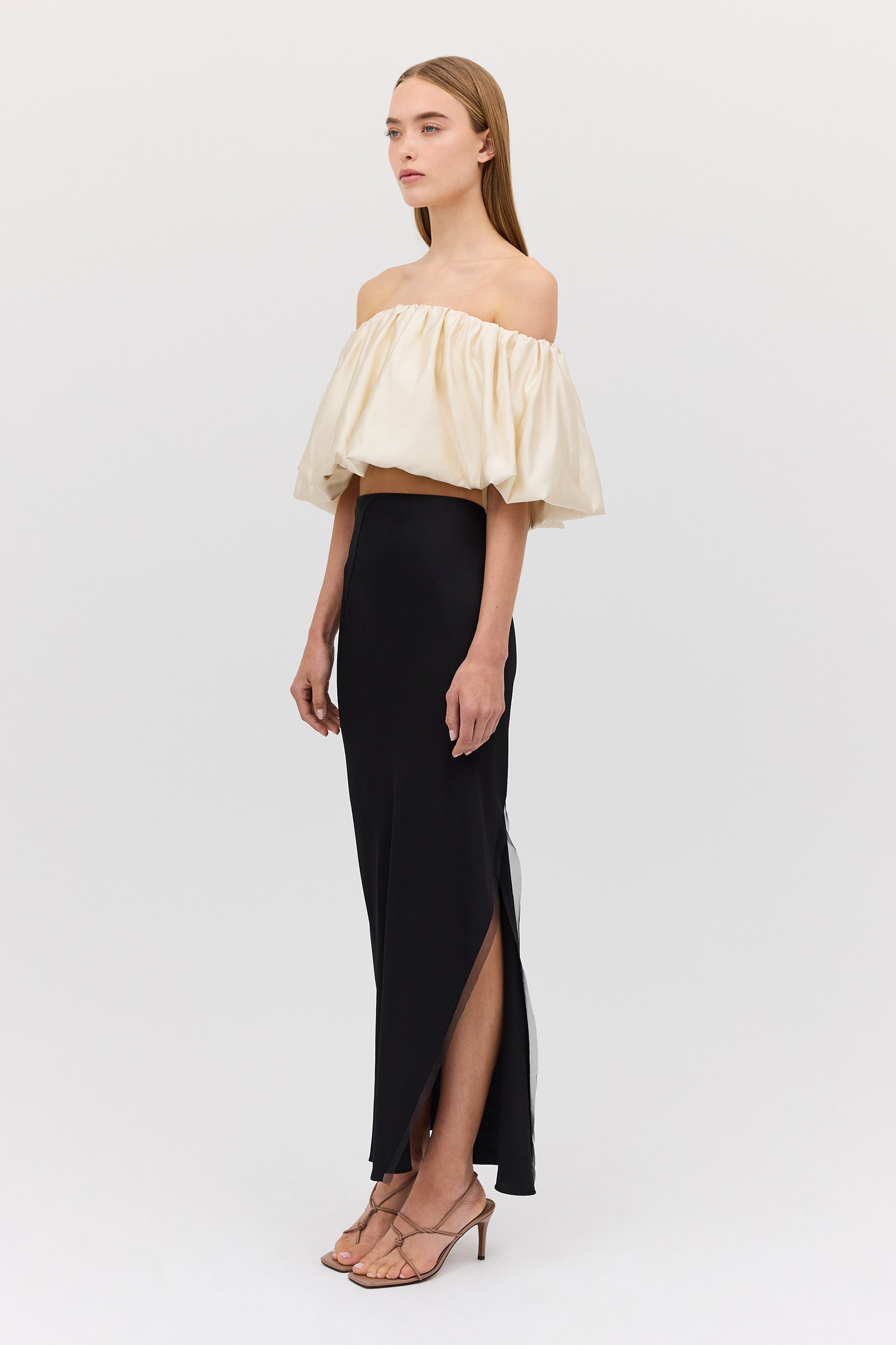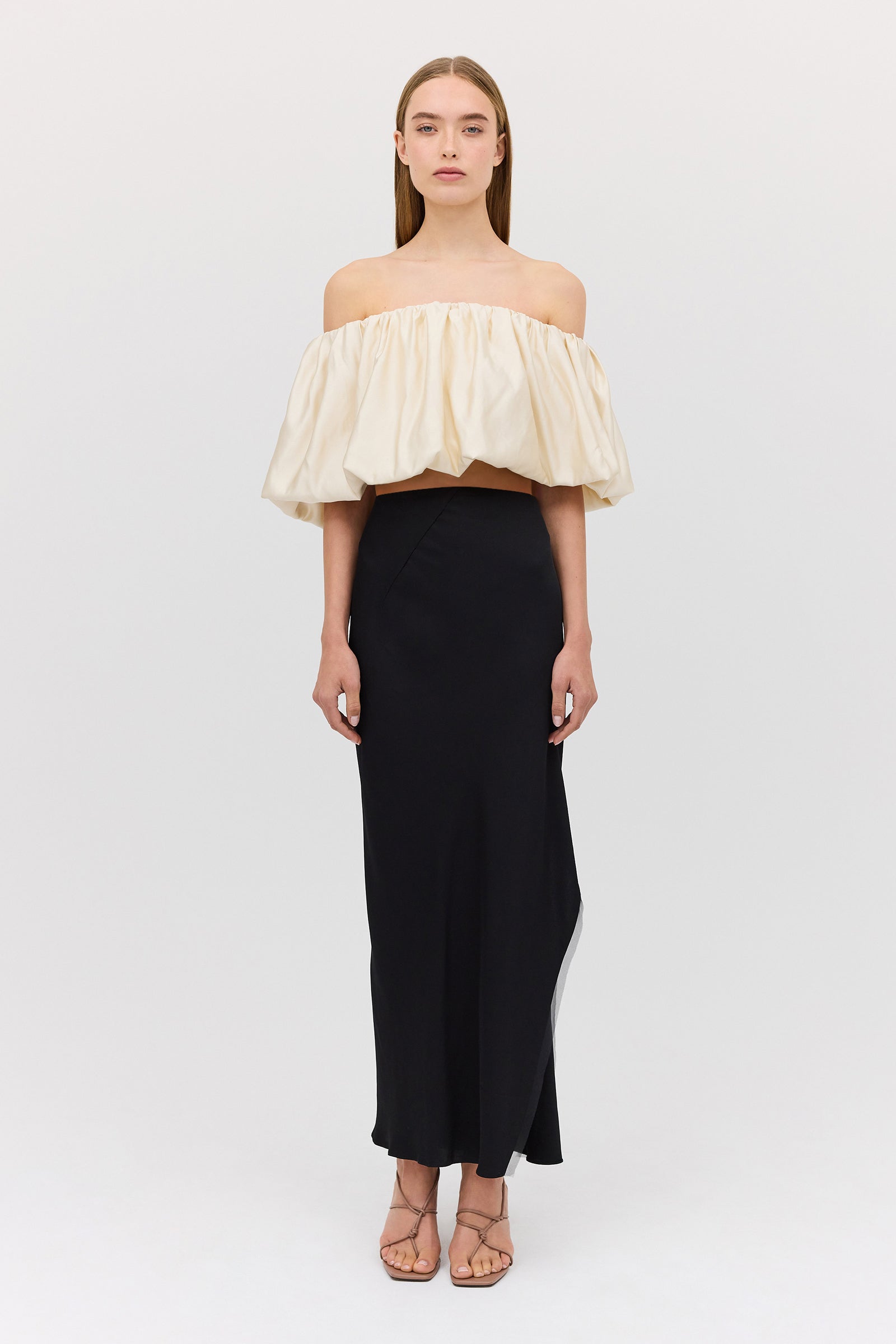 Evoke a sense of ease in the Black Satin Oblique Skirt, a fresh new season take on a most-loved Bianca Spender style. Cut on the bias and featuring Bianca's signature liquid drape, the Oblique Skirt softly skims and flatters the form. Featuring a subtle split at the back of the garment for easy movement. Sheer organza trim adds the final detail.