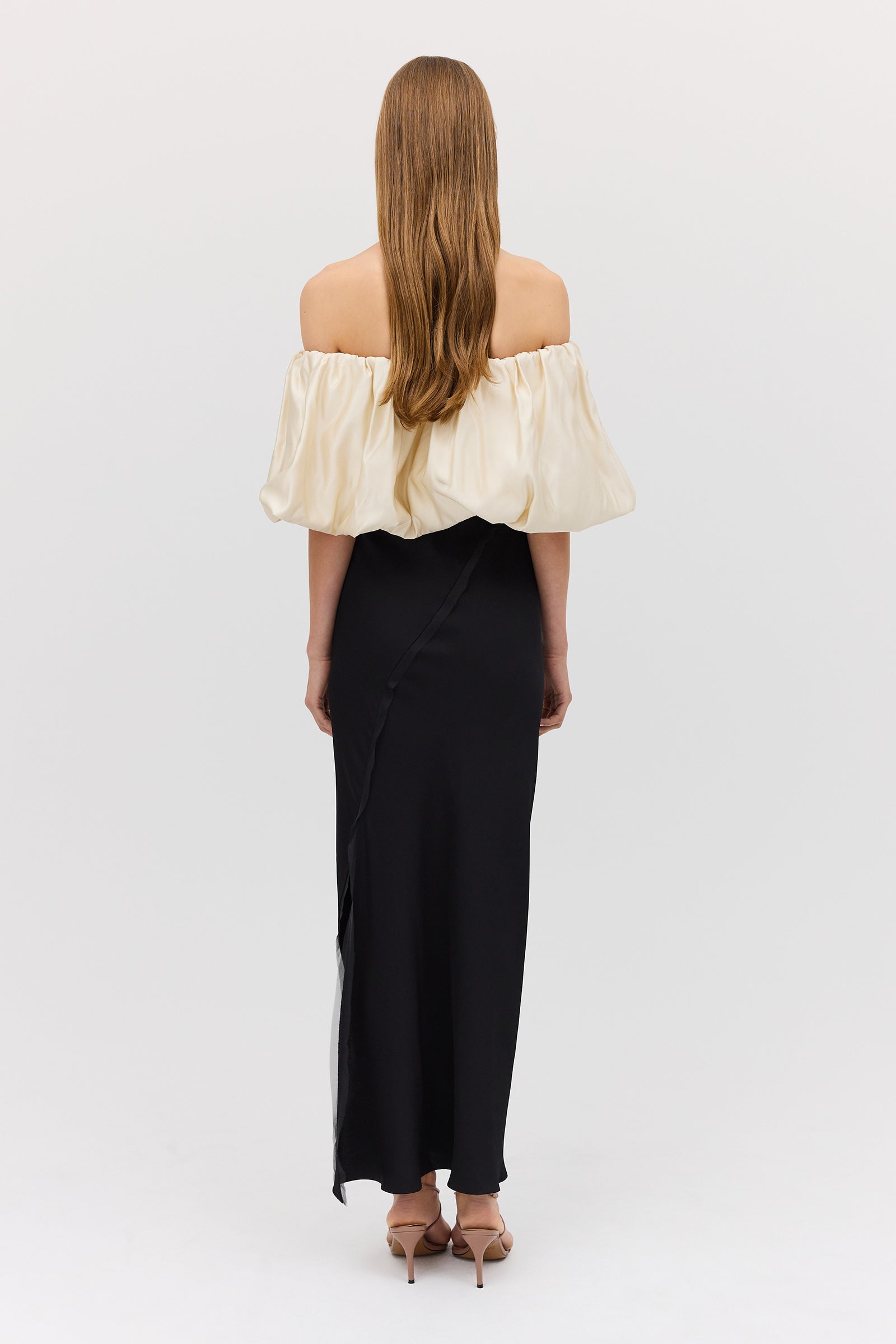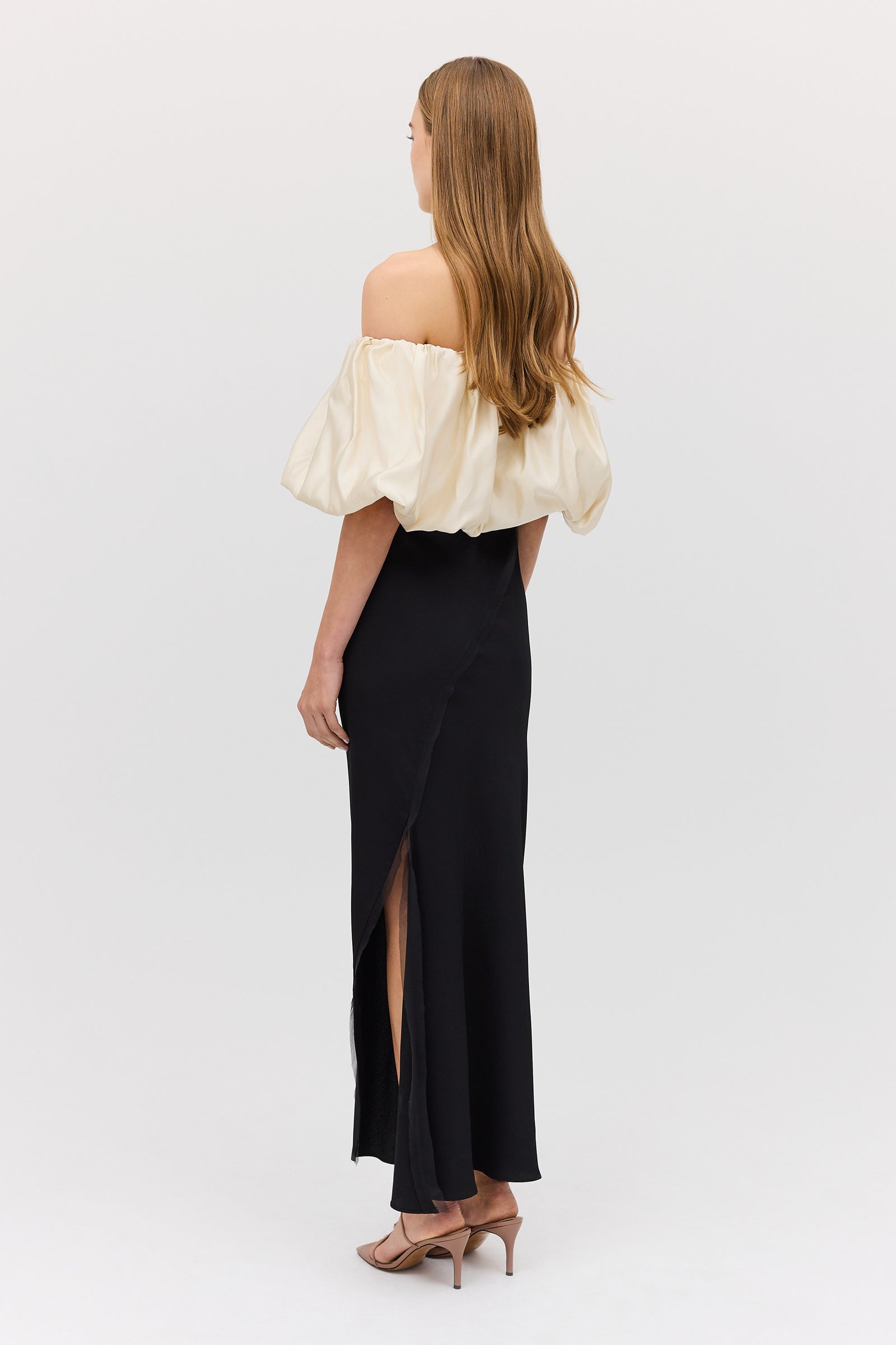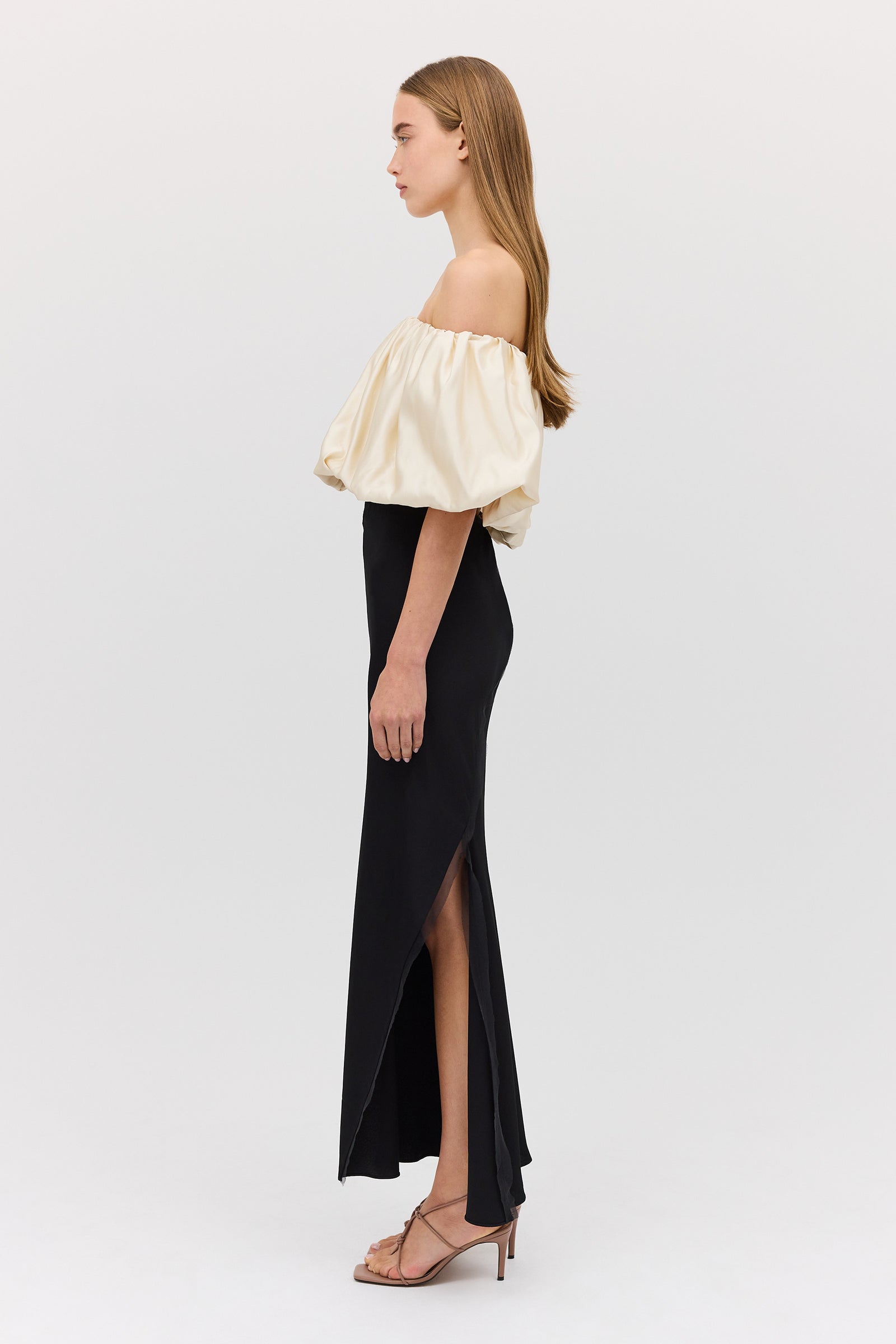 Evoke a sense of ease in the Black Satin Oblique Skirt, a fresh new season take on a most-loved Bianca Spender style. Cut on the bias and featuring Bianca's signature liquid drape, the Oblique Skirt softly skims and flatters the form. Featuring a subtle split at the back of the garment for easy movement. Sheer organza trim adds the final detail.