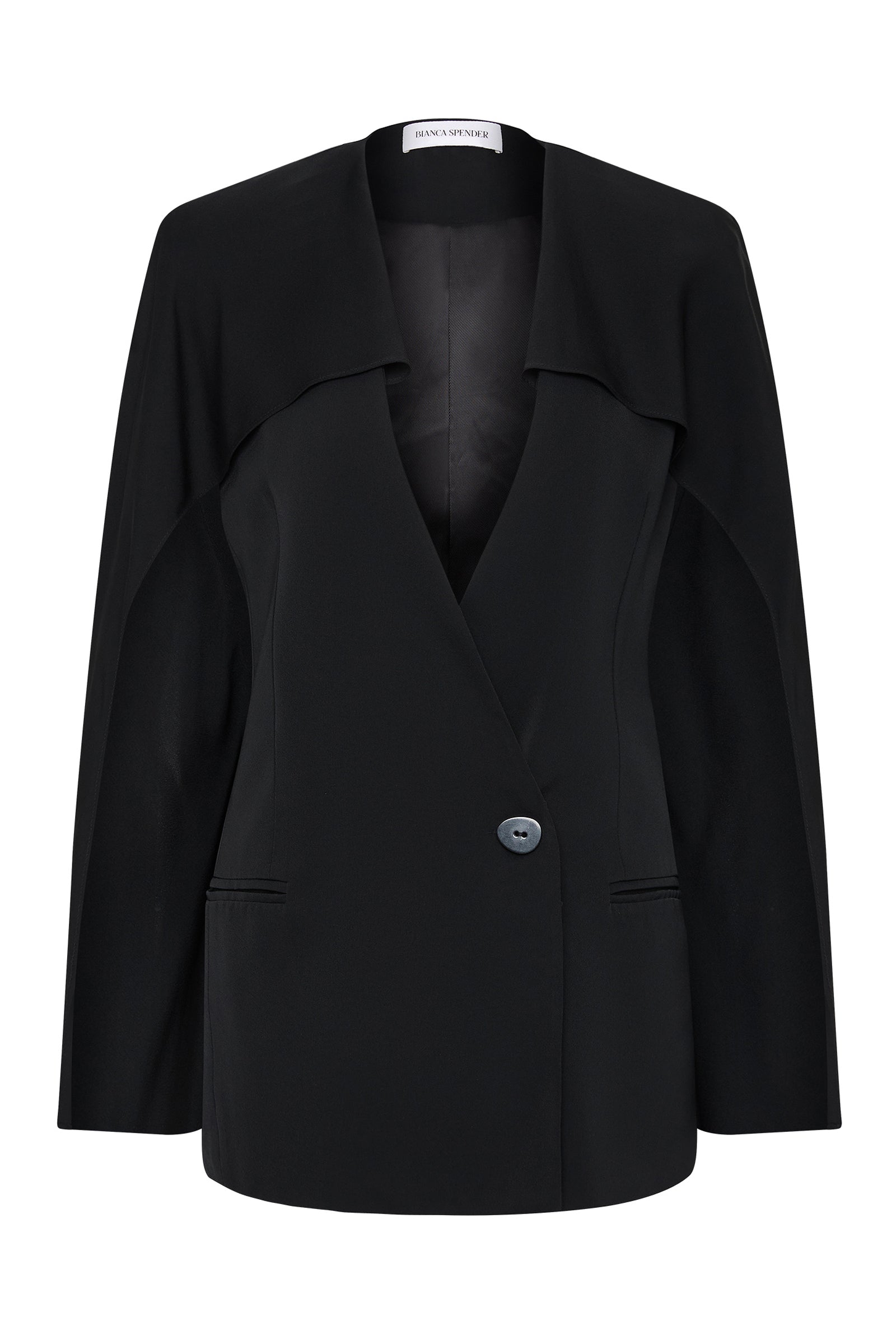 The Black Satin Spaces Cape Jacket redefines modern tailoring with a sophisticated yet relaxed approach. Crafted from premium black satin fabric, this jacket offers a bold and contemporary twist on traditional suiting. Its oversized silhouette exudes effortless chic, while the contrast satin lapel detail brings a playful and unexpected element to the design.
