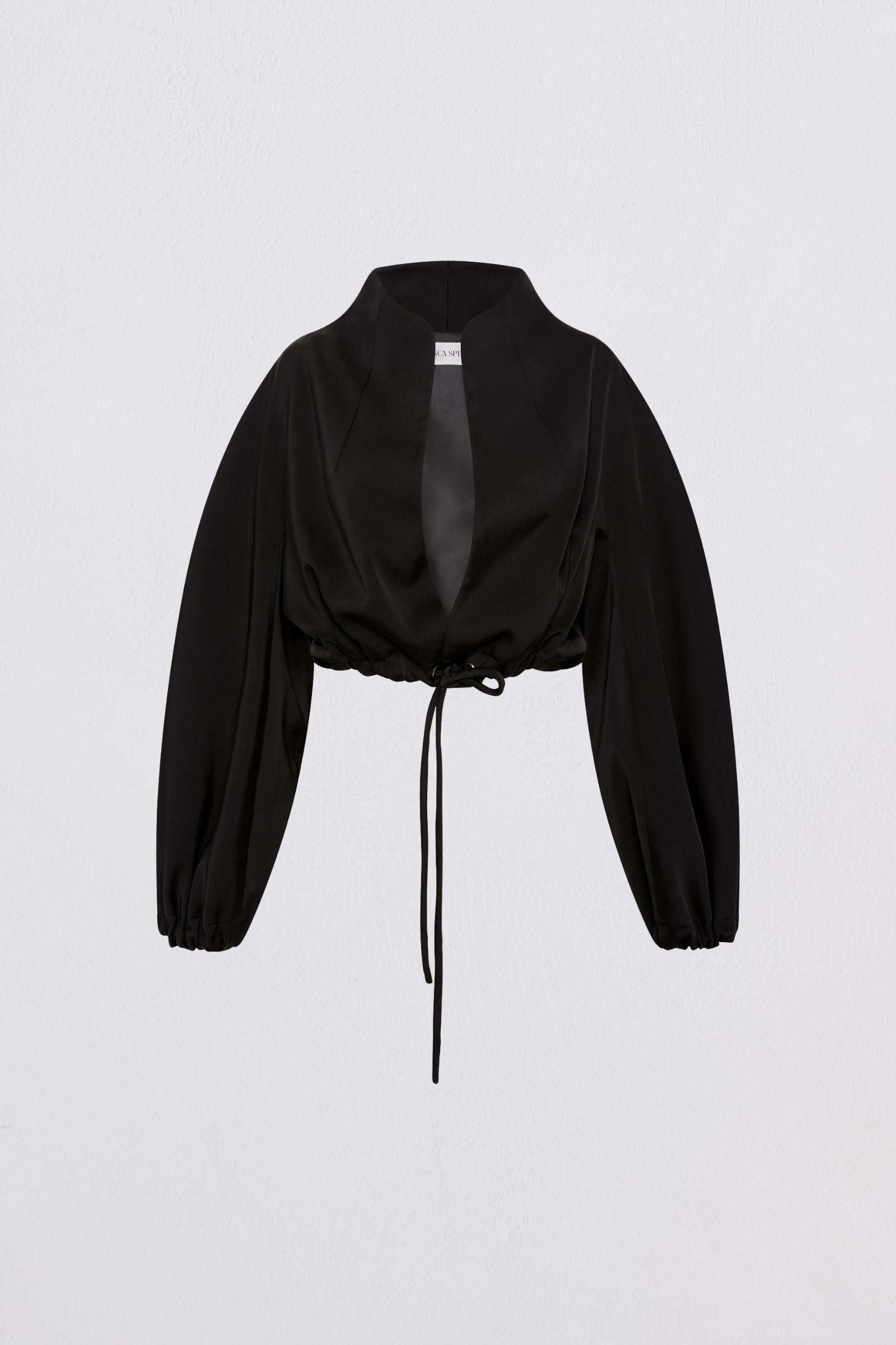Playing with volume, true to the aviation styles that inspired it, this relaxed, soft-silhouette bomber jacket is made from Black Crepe, featuring eyelets and a drawstring waist - synonymous with our Spring 2023 Runway collection and has statement puffed sleeves. Designed with the intention of wearing open as a deep V-neck top, pair with the Rafael Skirt or Surges shorts.