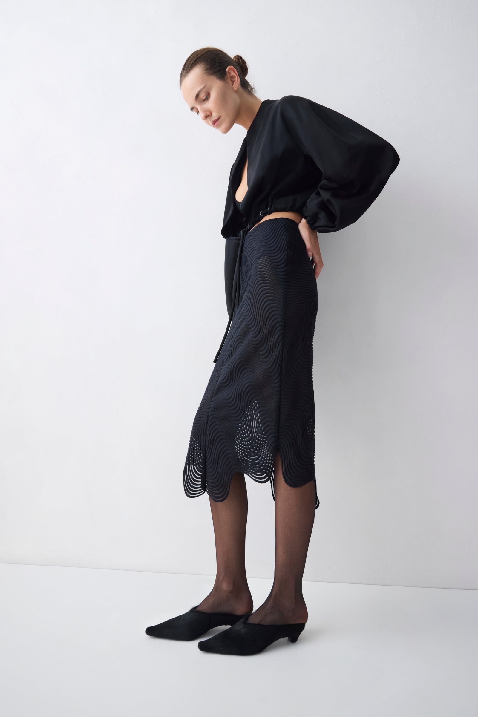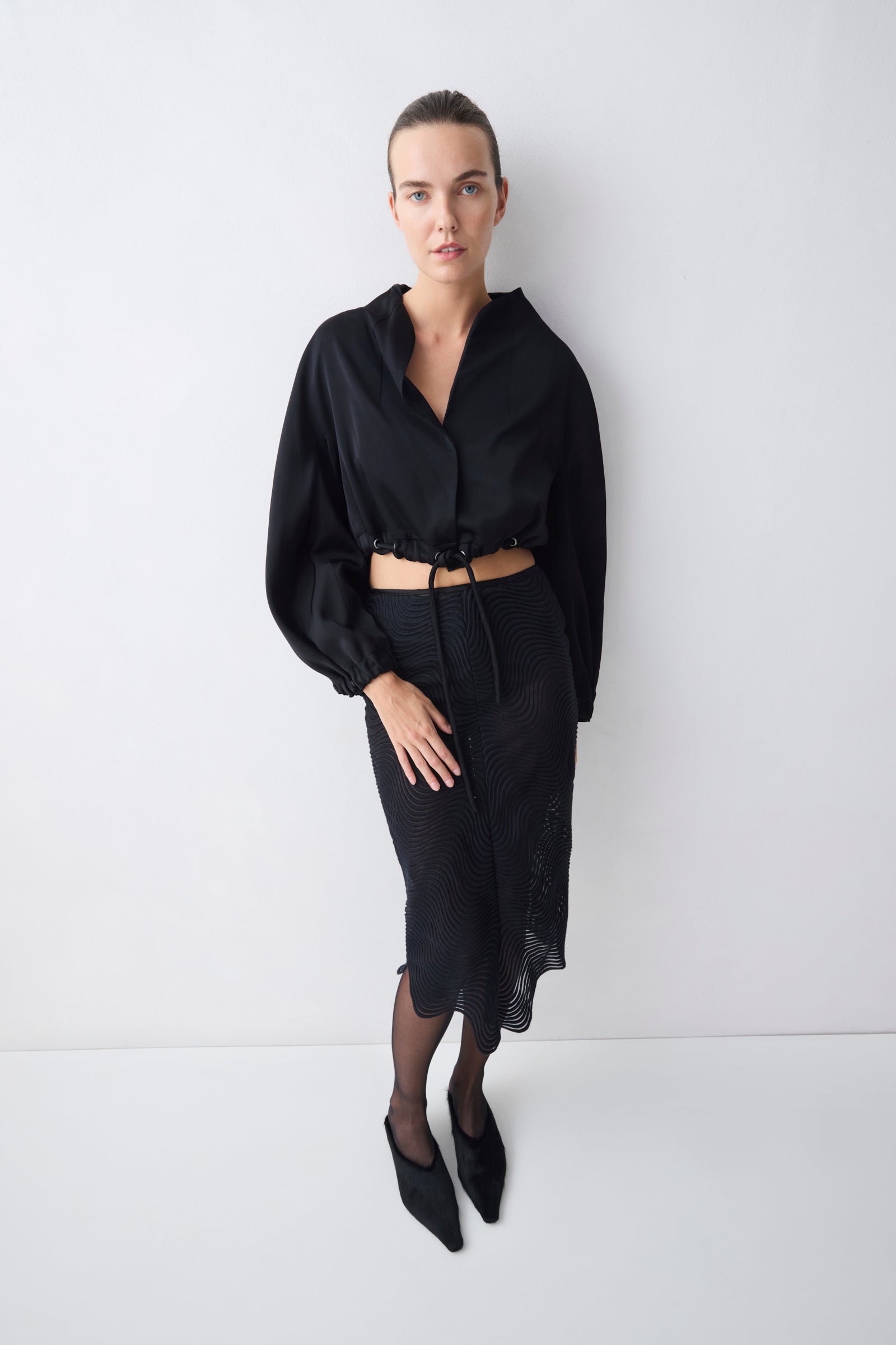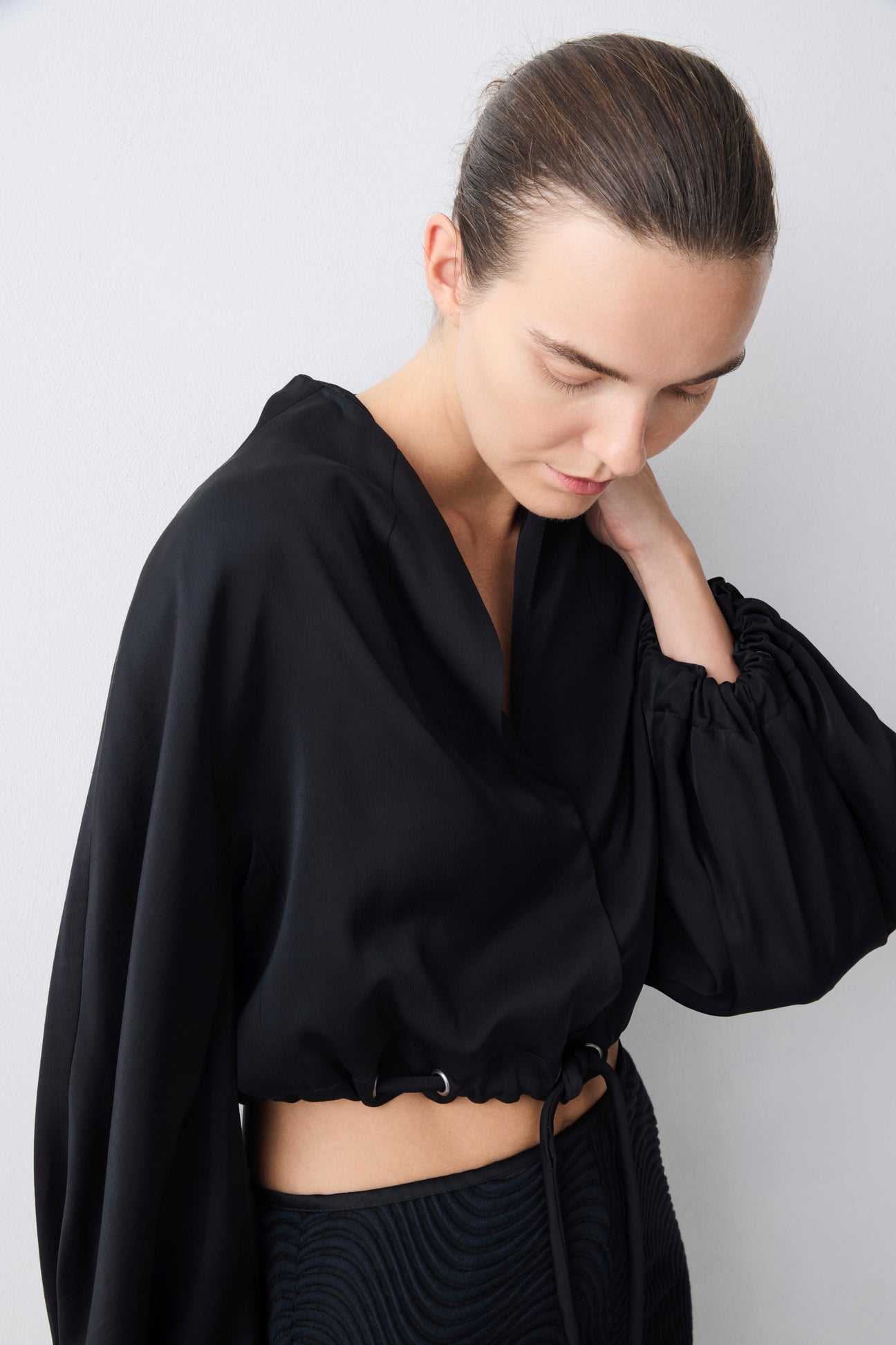 Playing with volume, true to the aviation styles that inspired it, this relaxed, soft-silhouette bomber jacket is made from Black Crepe, featuring eyelets and a drawstring waist - synonymous with our Spring 2023 Runway collection and has statement puffed sleeves. Designed with the intention of wearing open as a deep V-neck top, pair with the Rafael Skirt or Surges shorts.