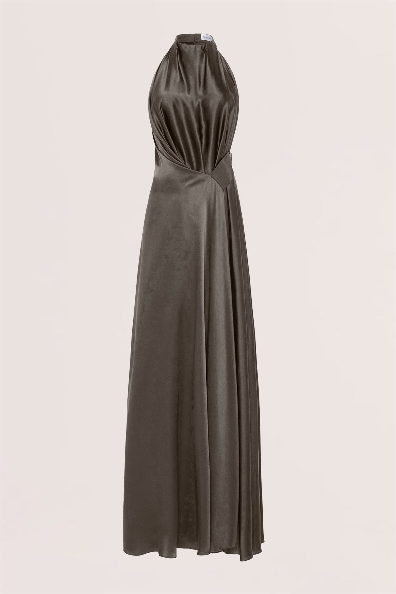 The Isabella Gown exudes glamour and sophistication. The gown is cut from lustrous Bronze silk satin and gracefully falls to the ground, skimming the body. It features a high neckline and a delicate side adjustable belt that cinches in at the waist, creating a stunning feminine silhouette.