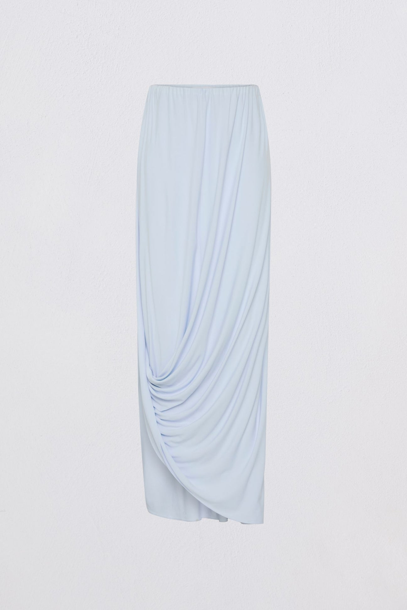 Effortless movement meets sculptural form in the Cloud Jersey Ripple Skirt, reimagined in a soft, fluid cloud jersey. Designed to fall gently from an elasticated waistband, the silhouette gathers and loops through the hem, creating natural drape and quiet dimension. An asymmetrical length and subtle side split enhance movement, allowing the fabric to flow with the body. Lightweight and sensuous, the liquid-like jersey skims the form with ease, offering comfort without compromise.