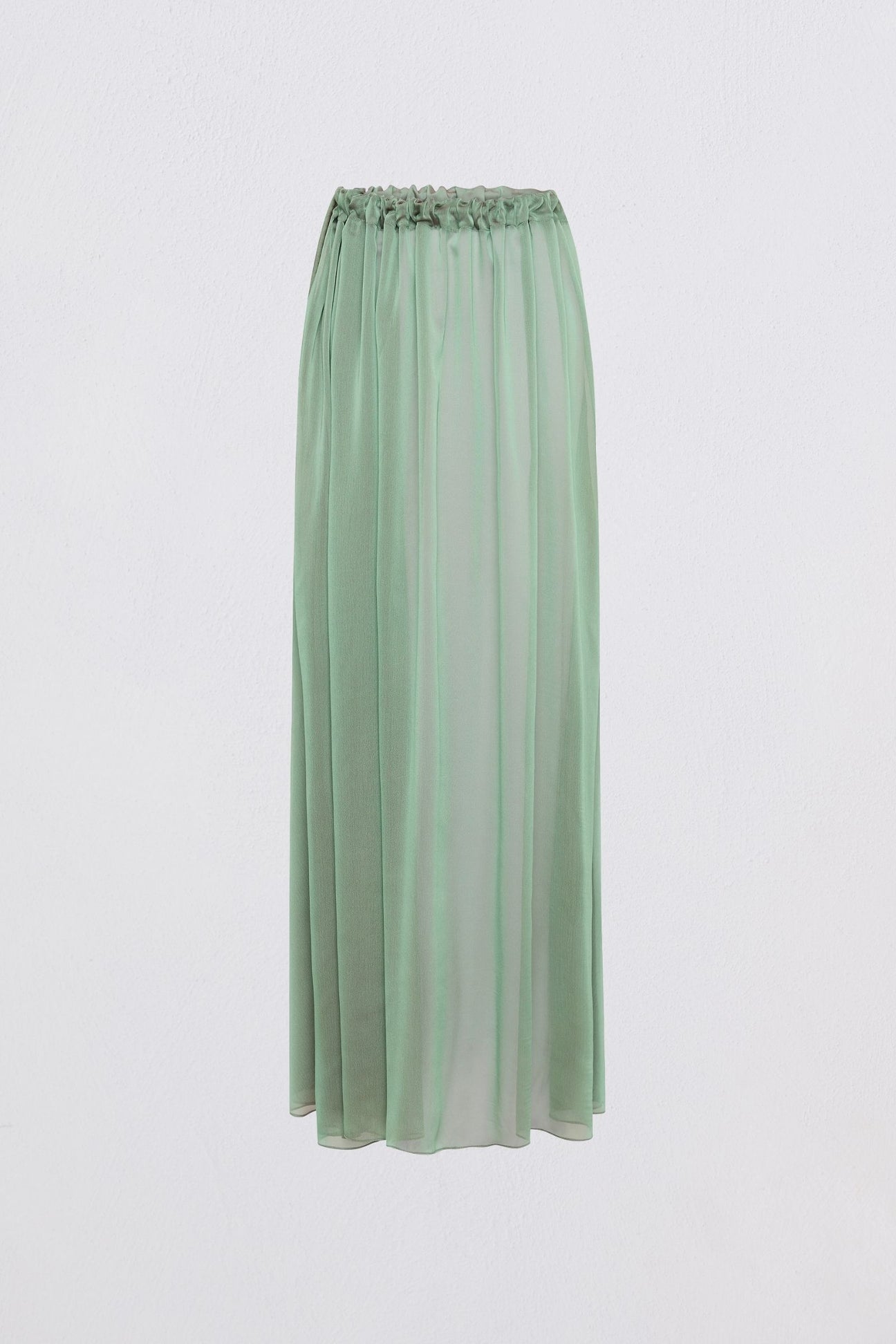 Rendered in whisper-light chiffon, the Fern Effuse Skirt moves with an effortless fluidity - its sheer layers catching the light with a subtle, liquid-like sheen. Falling from a soft drawstring waist, the silhouette drapes to the floor in a cascade of translucent green, evoking the shimmer of water in motion.
