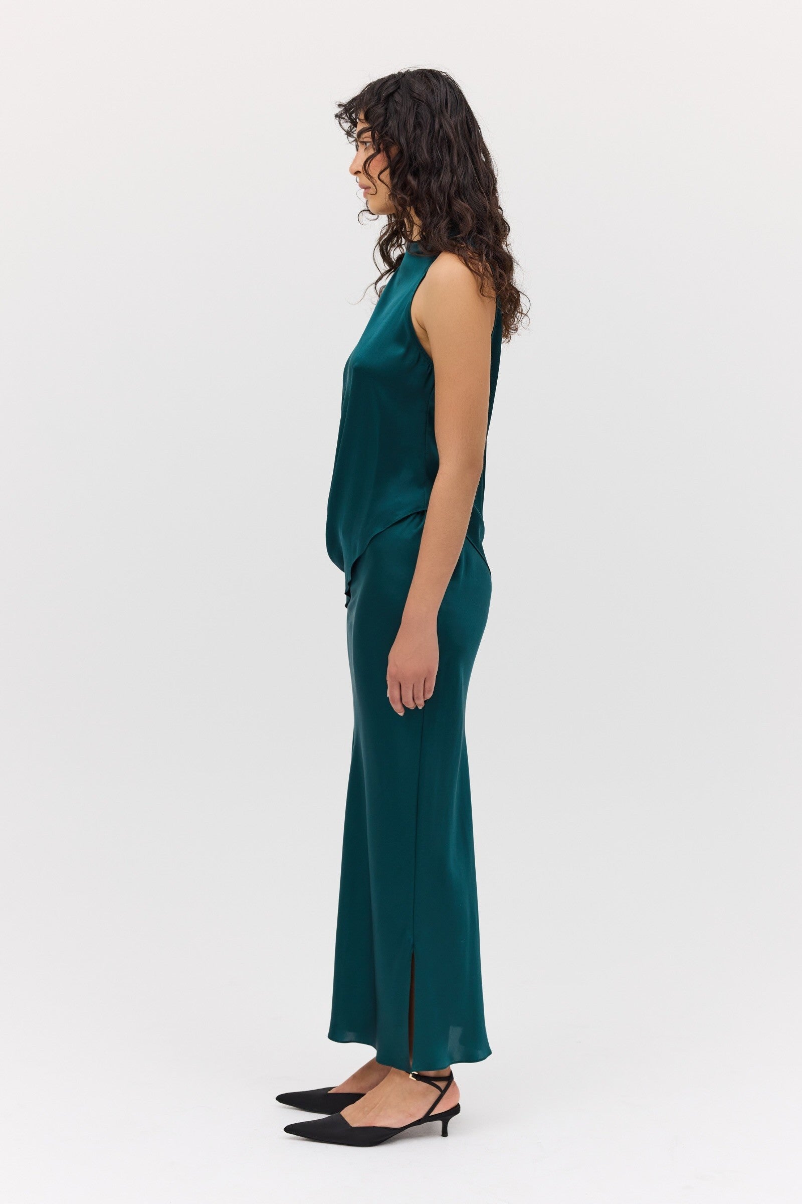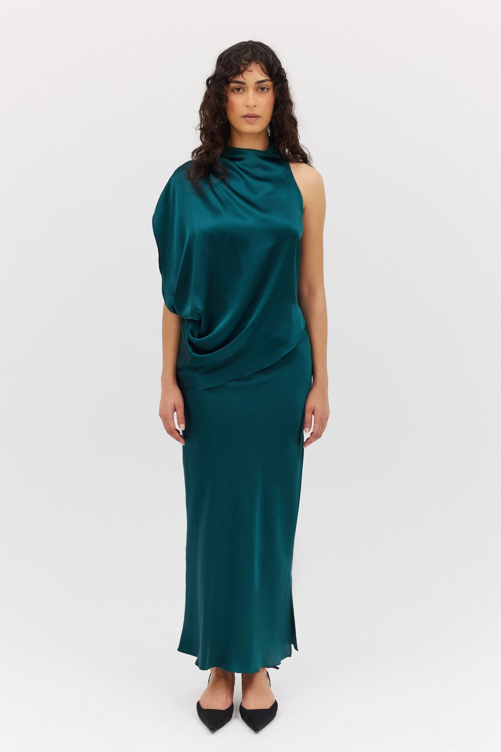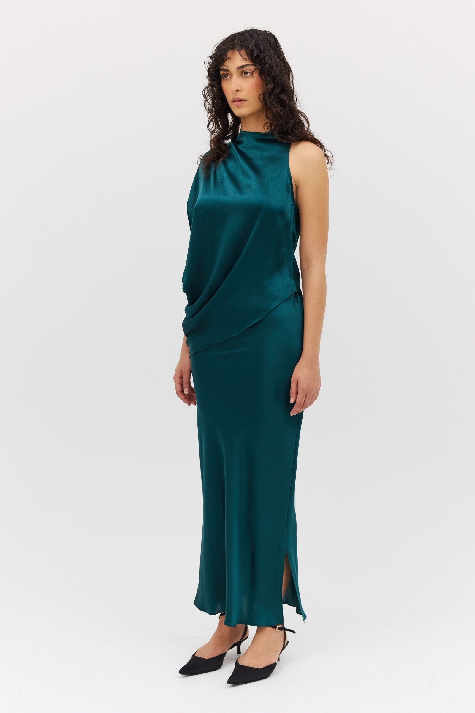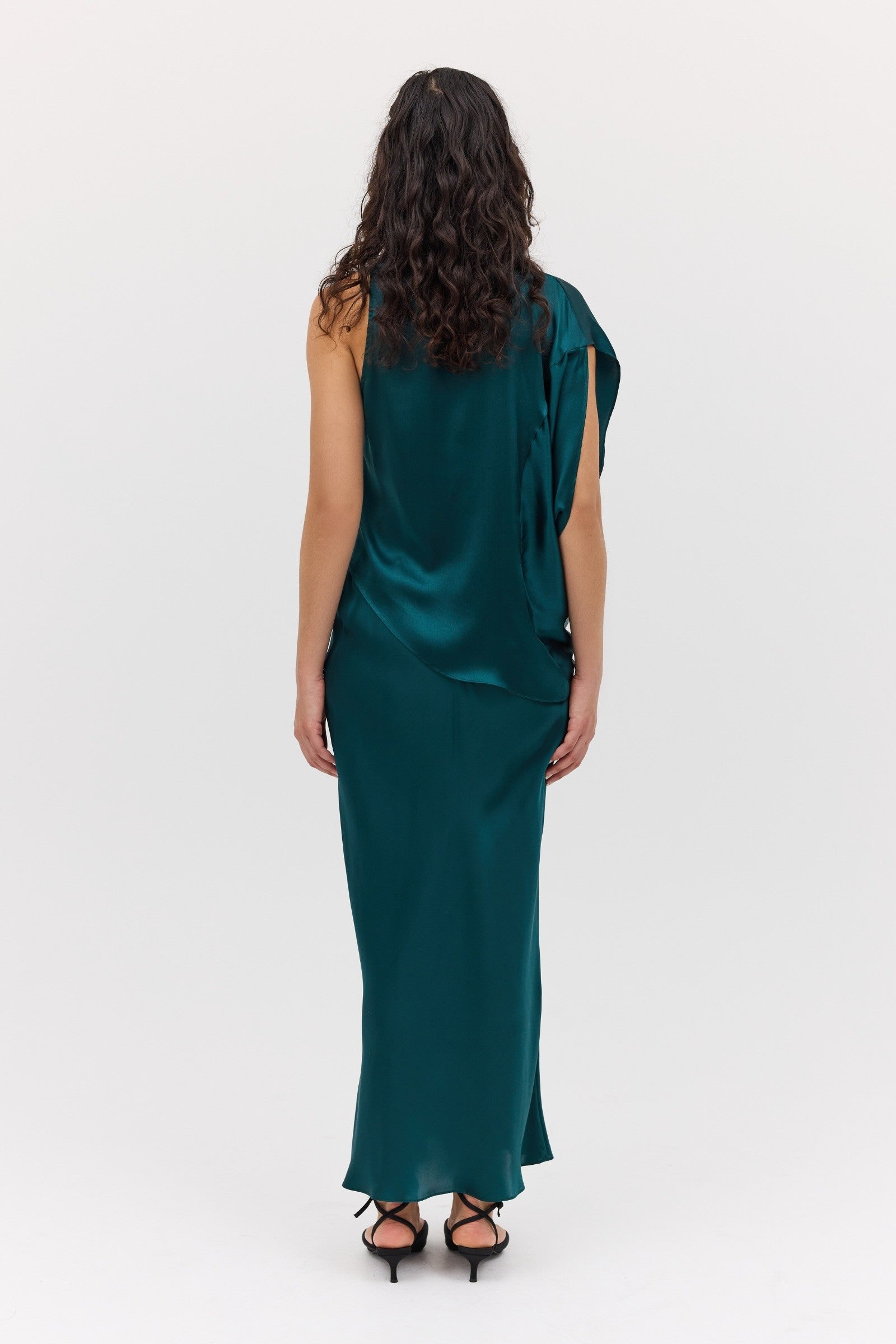 Our bestseller returns. Meet the Rafael Skirt. The full-length skirt in Petrol Silk Satin is designed with refreshing symmetry accentuated through the use of eyelets and drawstrings designed for adjustability and versatility adding longevity.