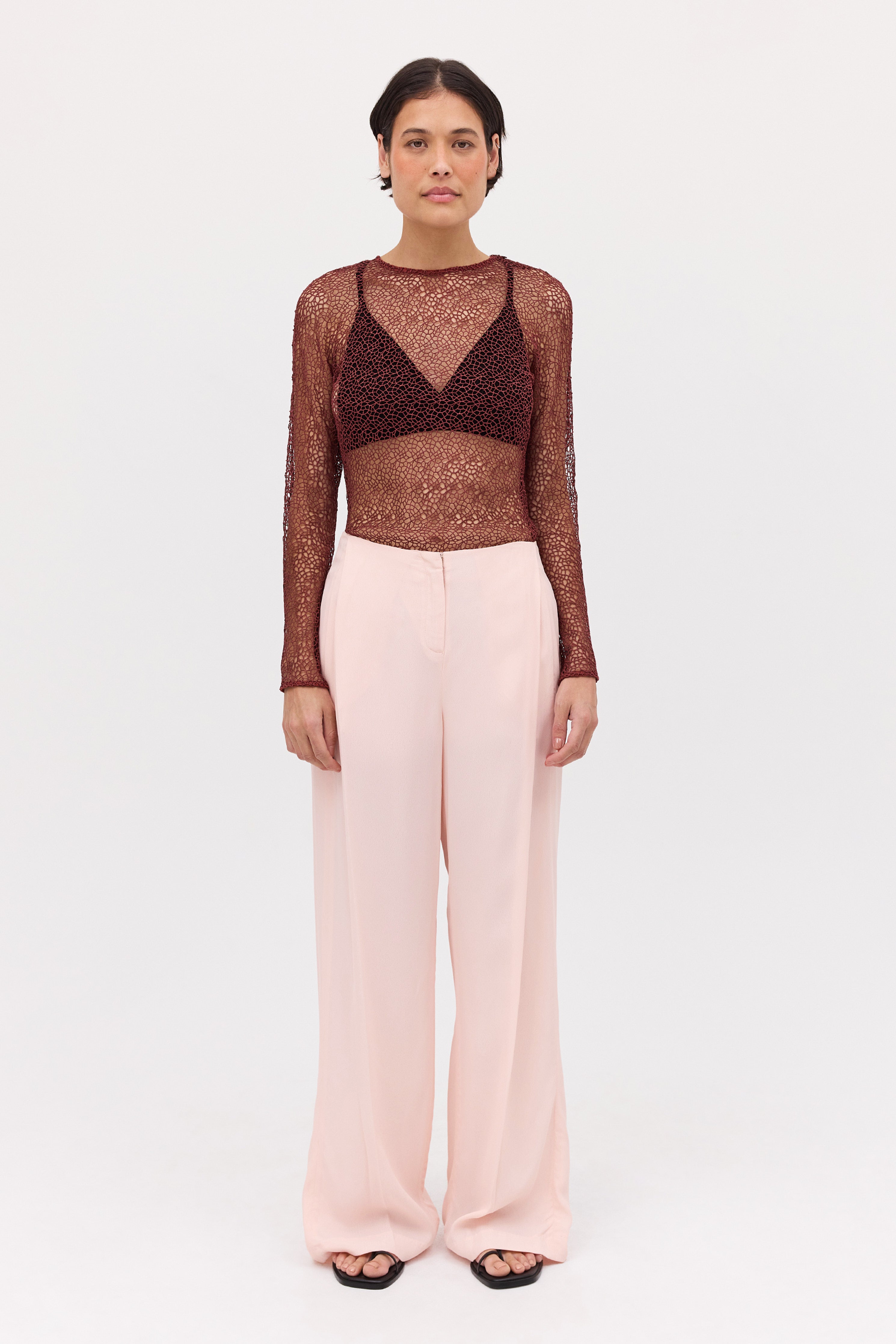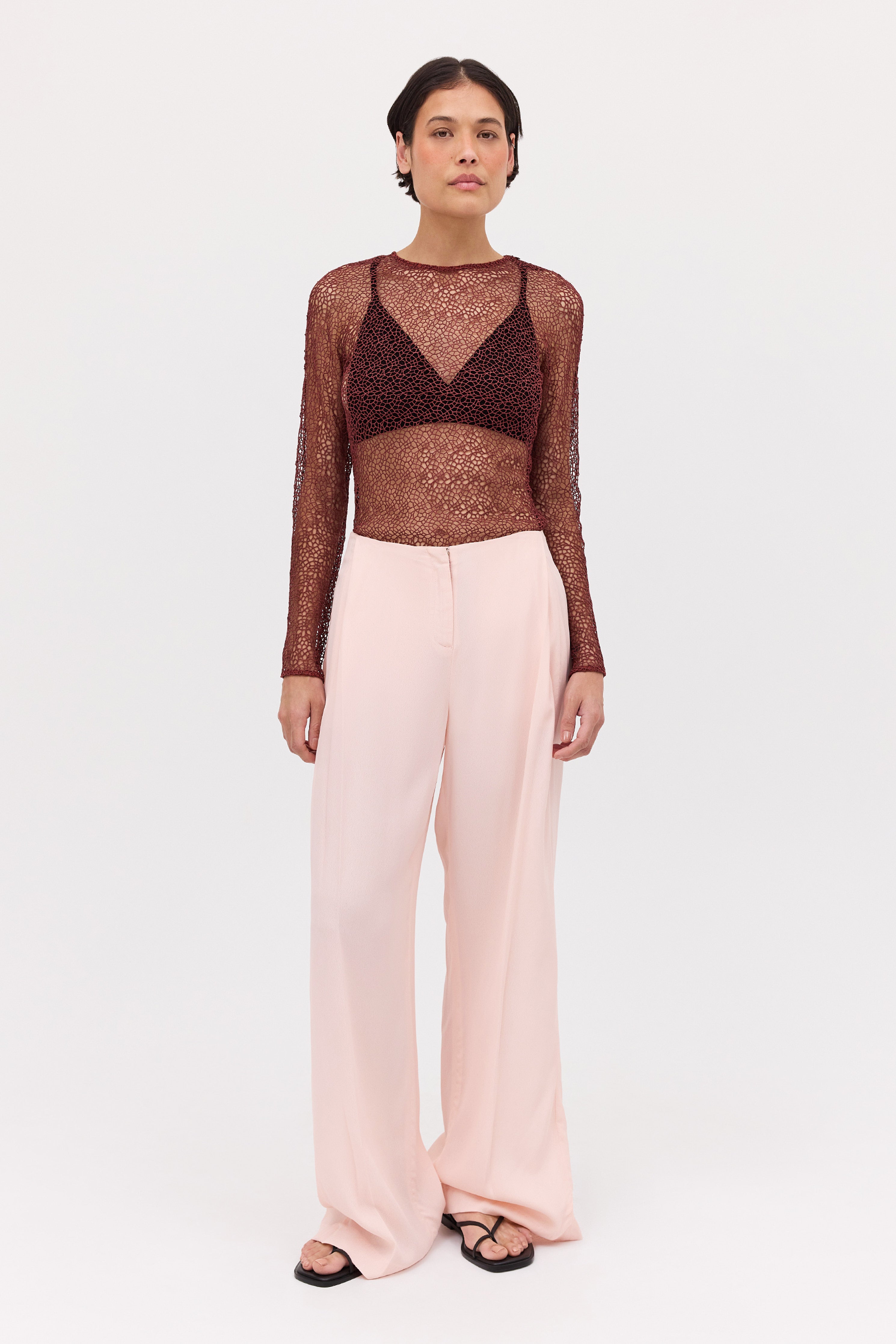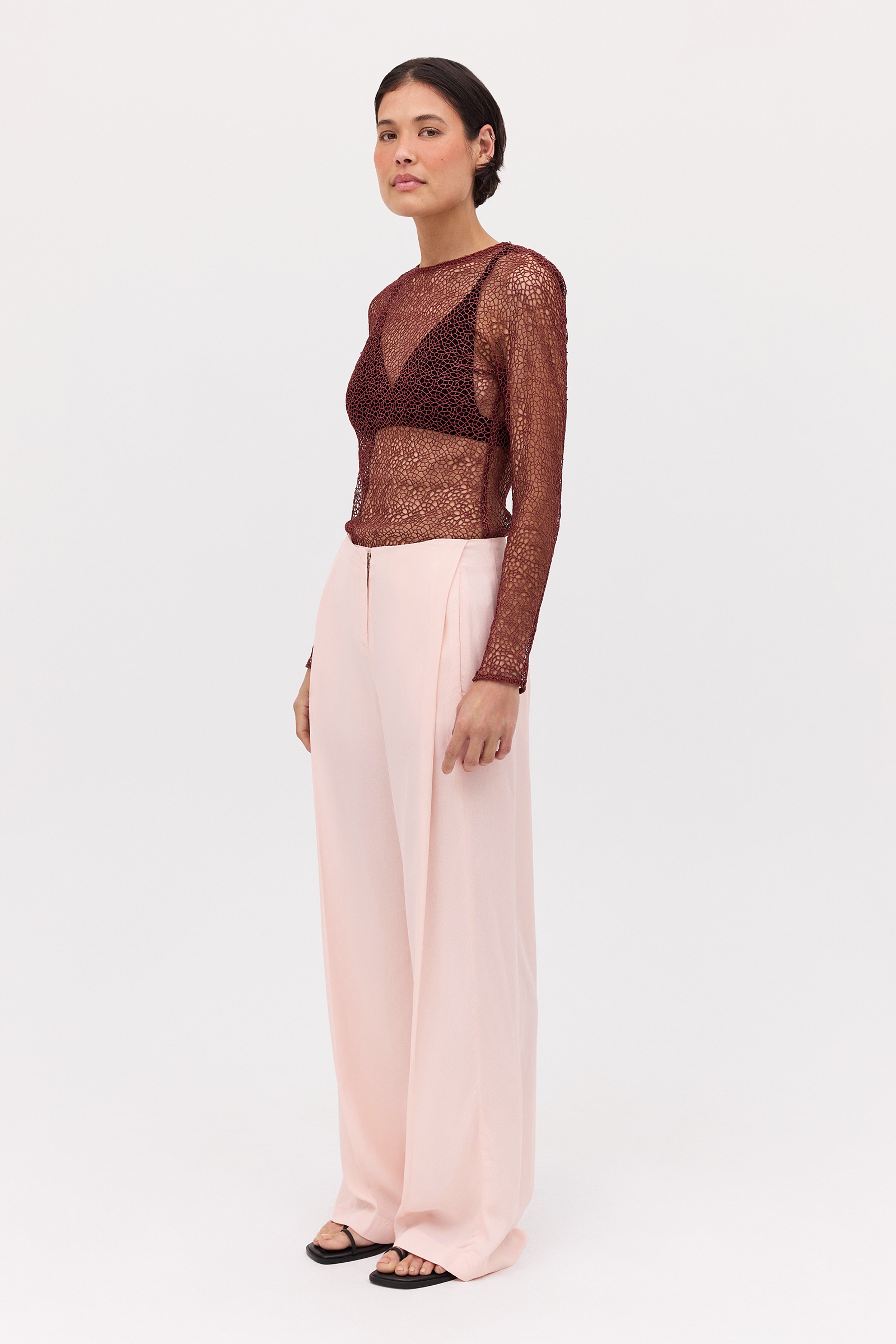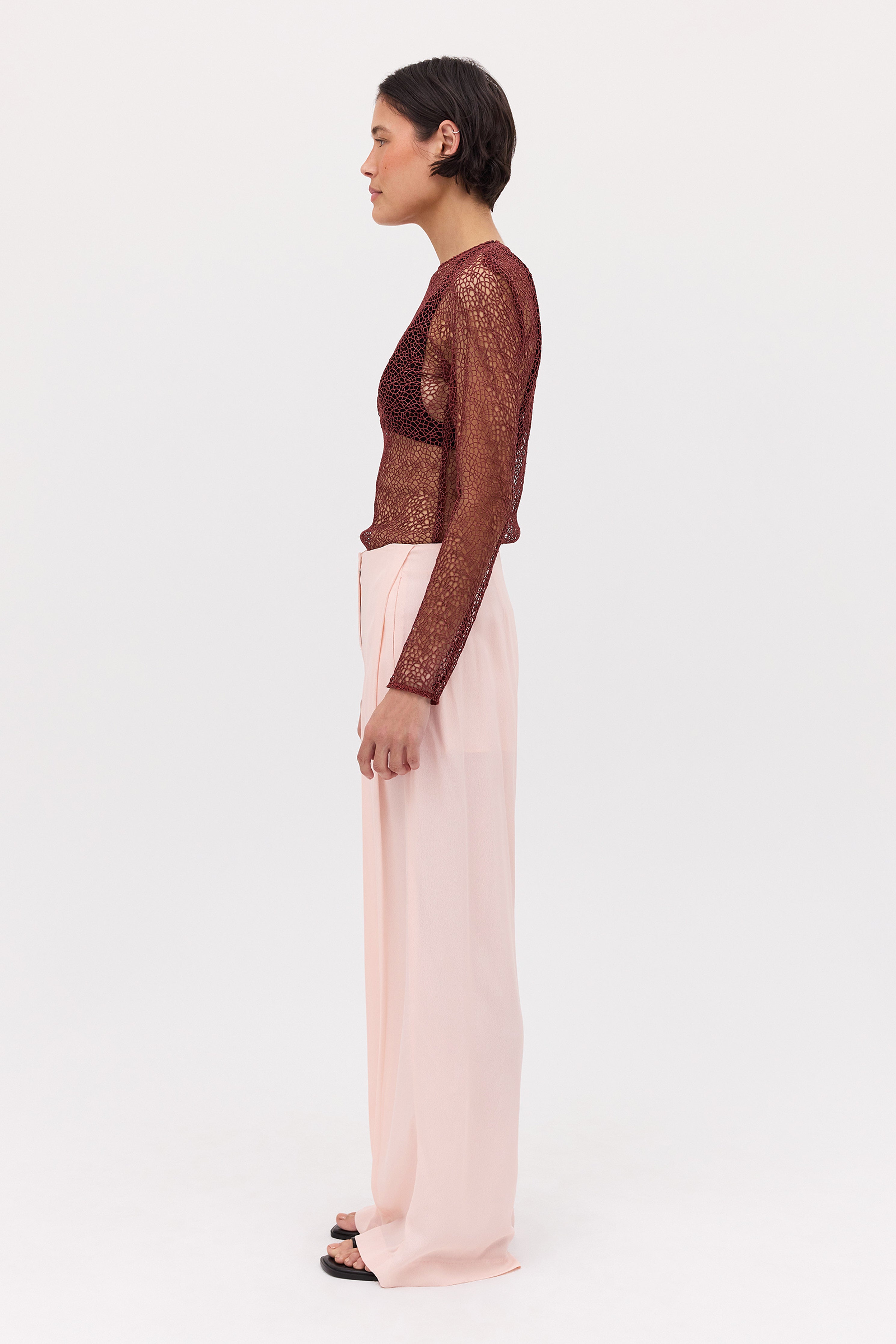 Your most-loved Ray Pant is back, reimagined for the Spring 24 season. The Pink Crepe Ray Pant features an inverted tuck down the front of the leg, a zip and hook and eye fastening and flowing into a wide-leg trouser designed to touch the floor.