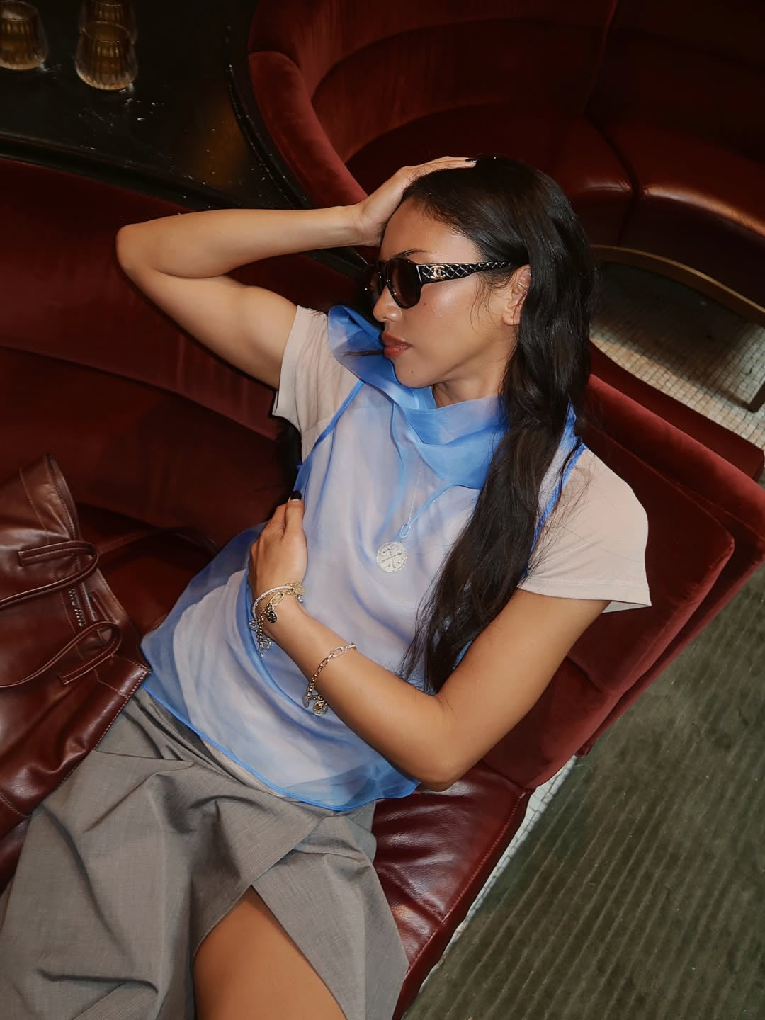 A sheer, sculptural layer reimagined in a luminous new hue. The Cezanne Top in Sky is crafted from 100% silk organza, celebrated for its featherlight touch and ethereal drape. The signature cowl neckline and asymmetrical shoulder detail bring a sense of movement and fluidity to the form, finished with delicate French seams that speak to refined craftsmanship. Designed to be worn close to the skin, it offers luxurious texture and subtle allure, perfect for transeasonal layering or as a sheer statement as the season shifts.