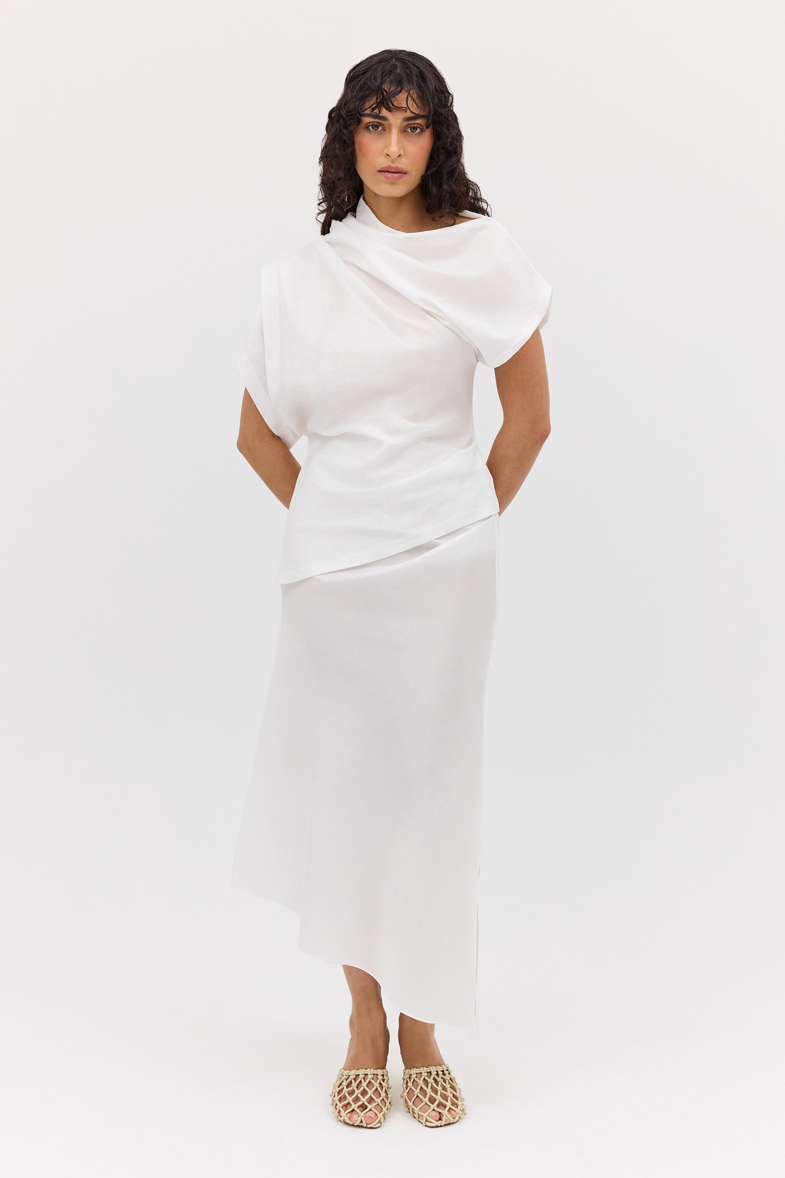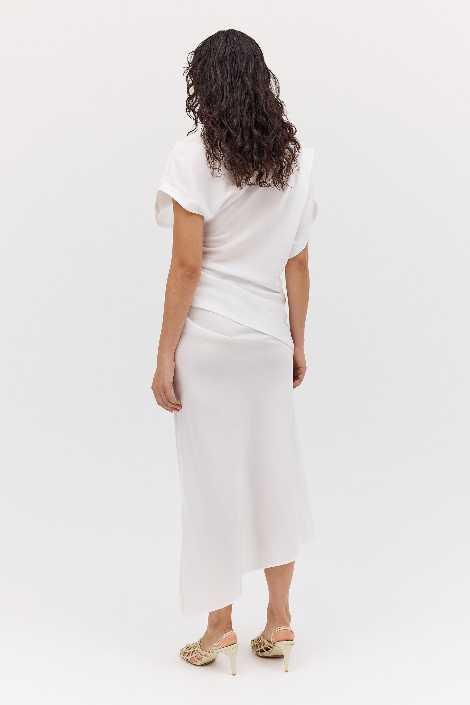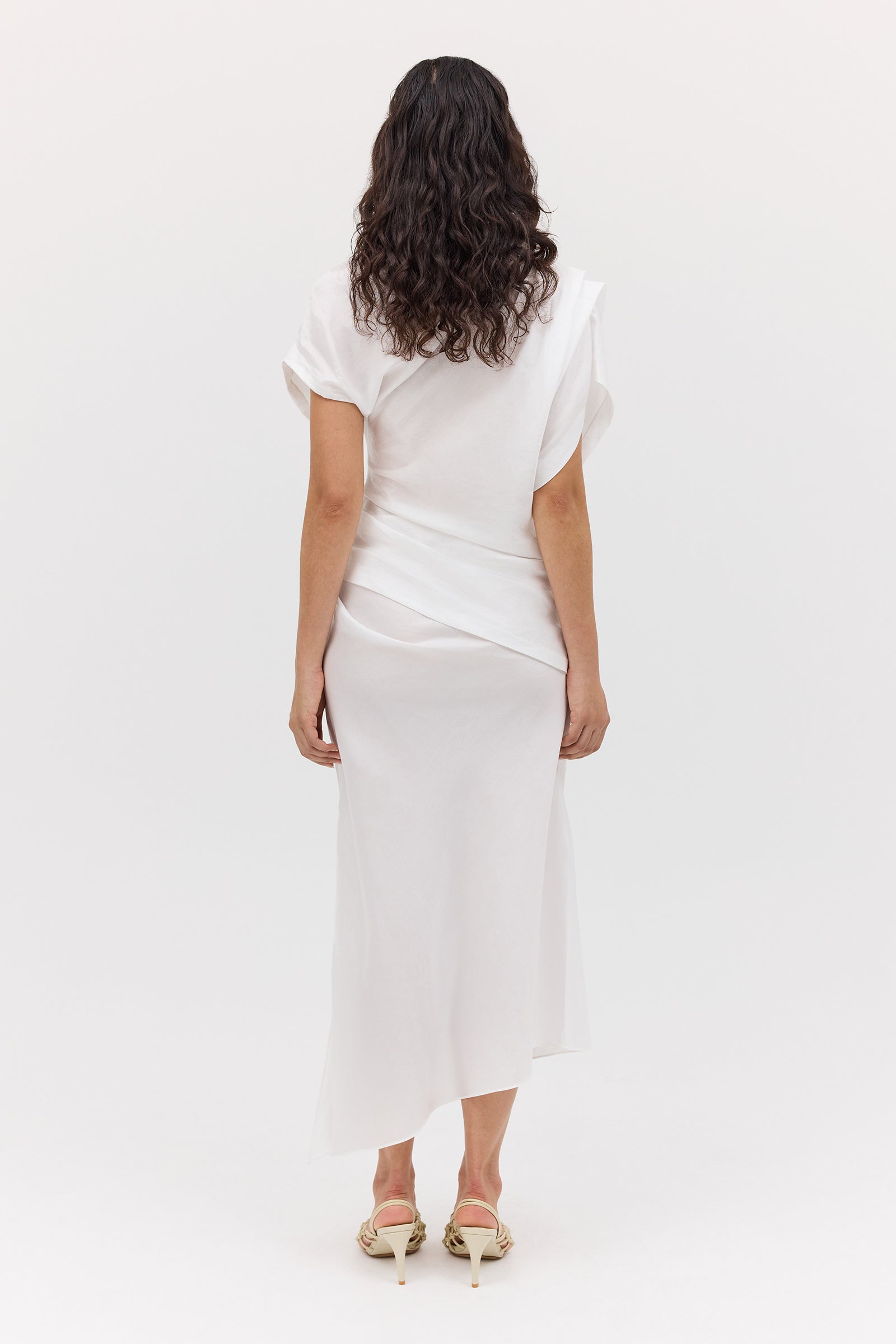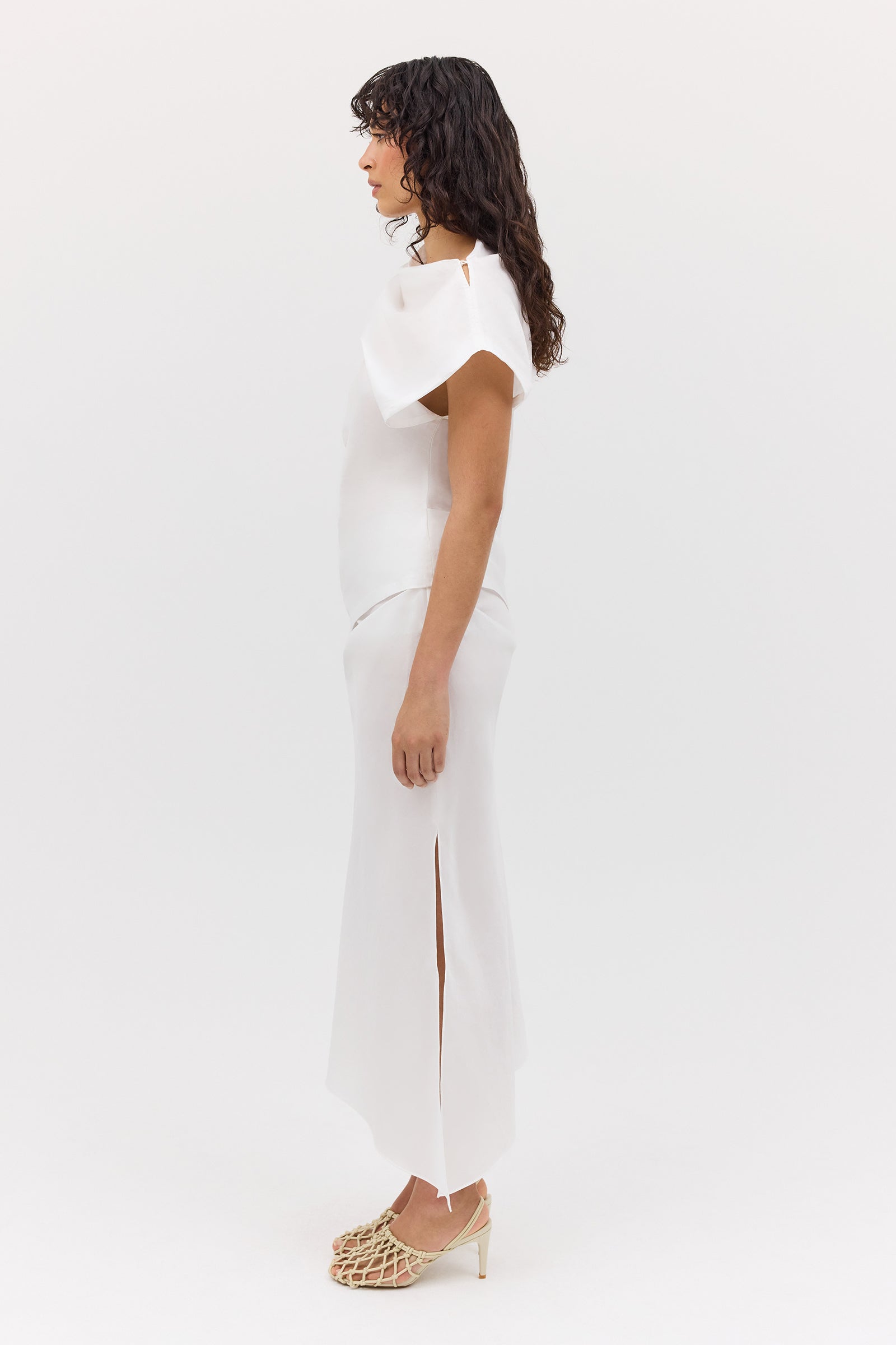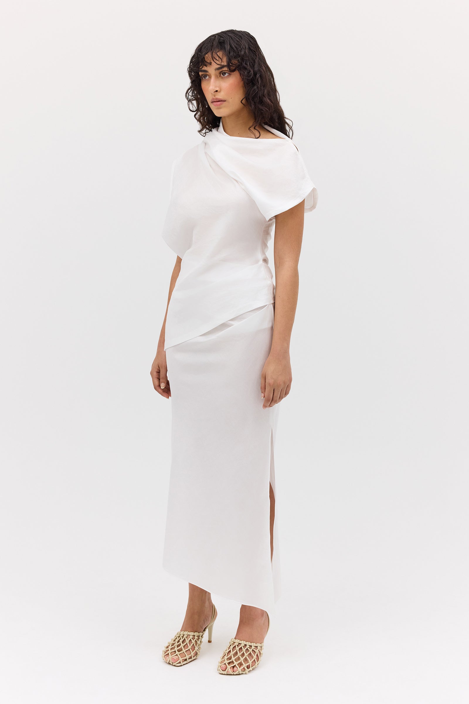 Introducing the White Cotton Clinch Skirt — a study in crisp simplicity and quiet structure. Crafted from breathable cotton, this piece balances clean lines with subtle volume, capturing the brand’s signature take on modern femininity. The refined silhouette is designed to move with ease, transitioning effortlessly from everyday moments to elevated occasions.
